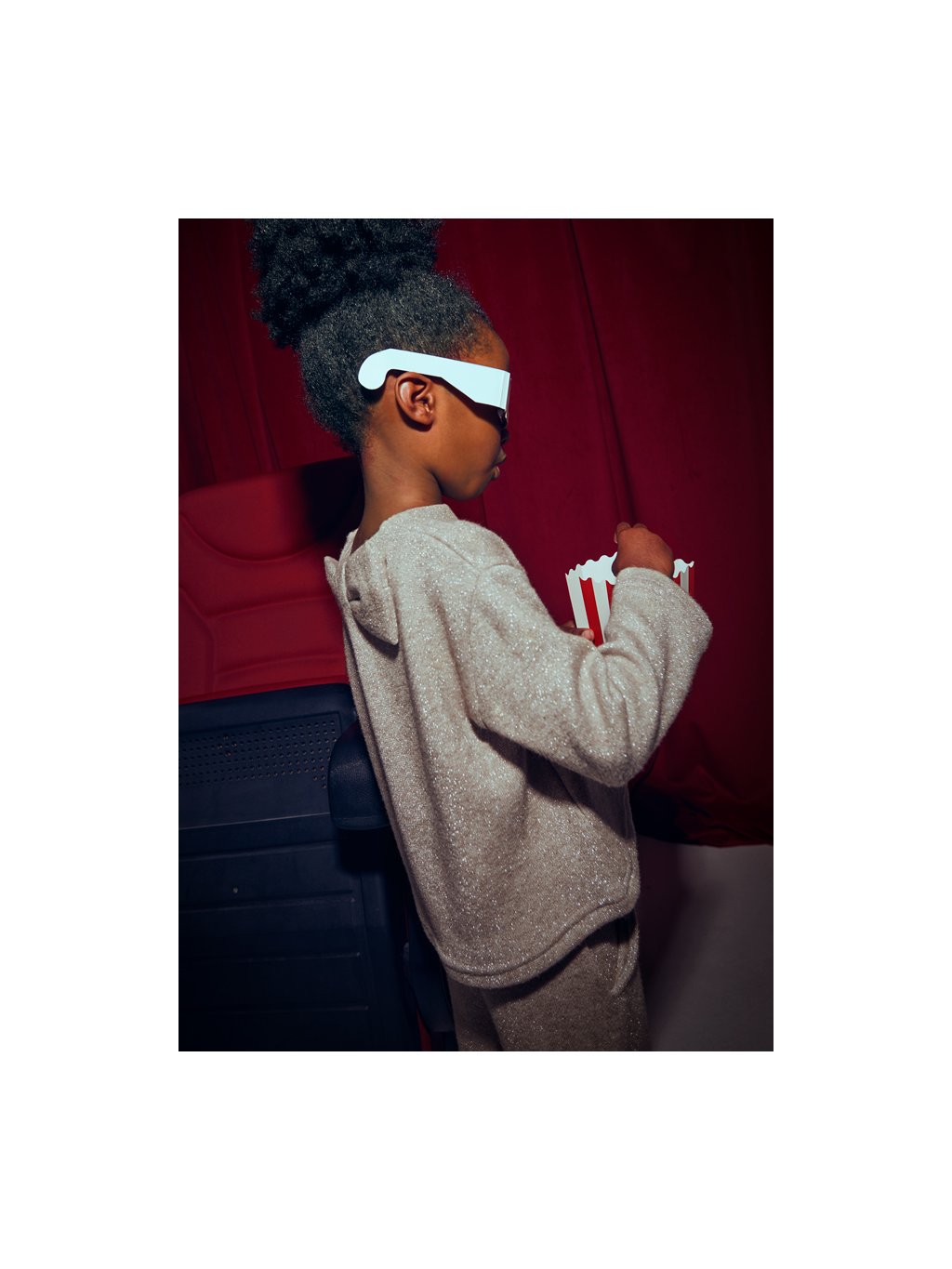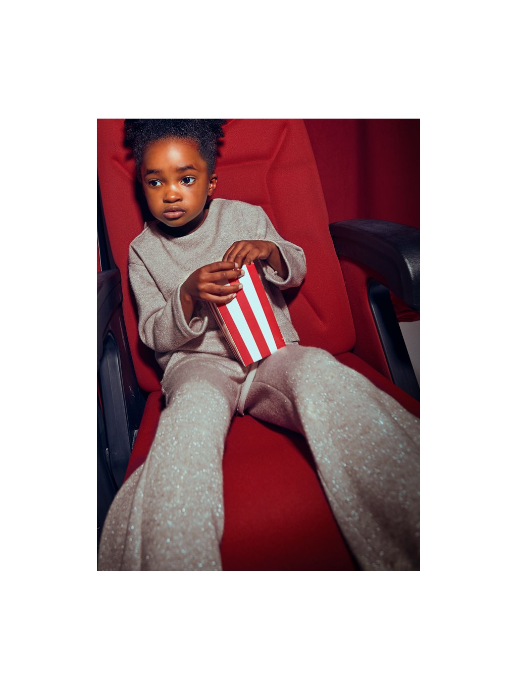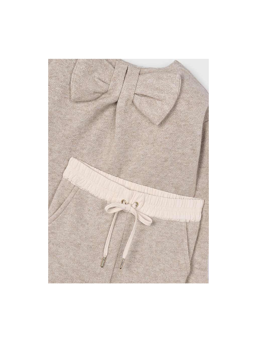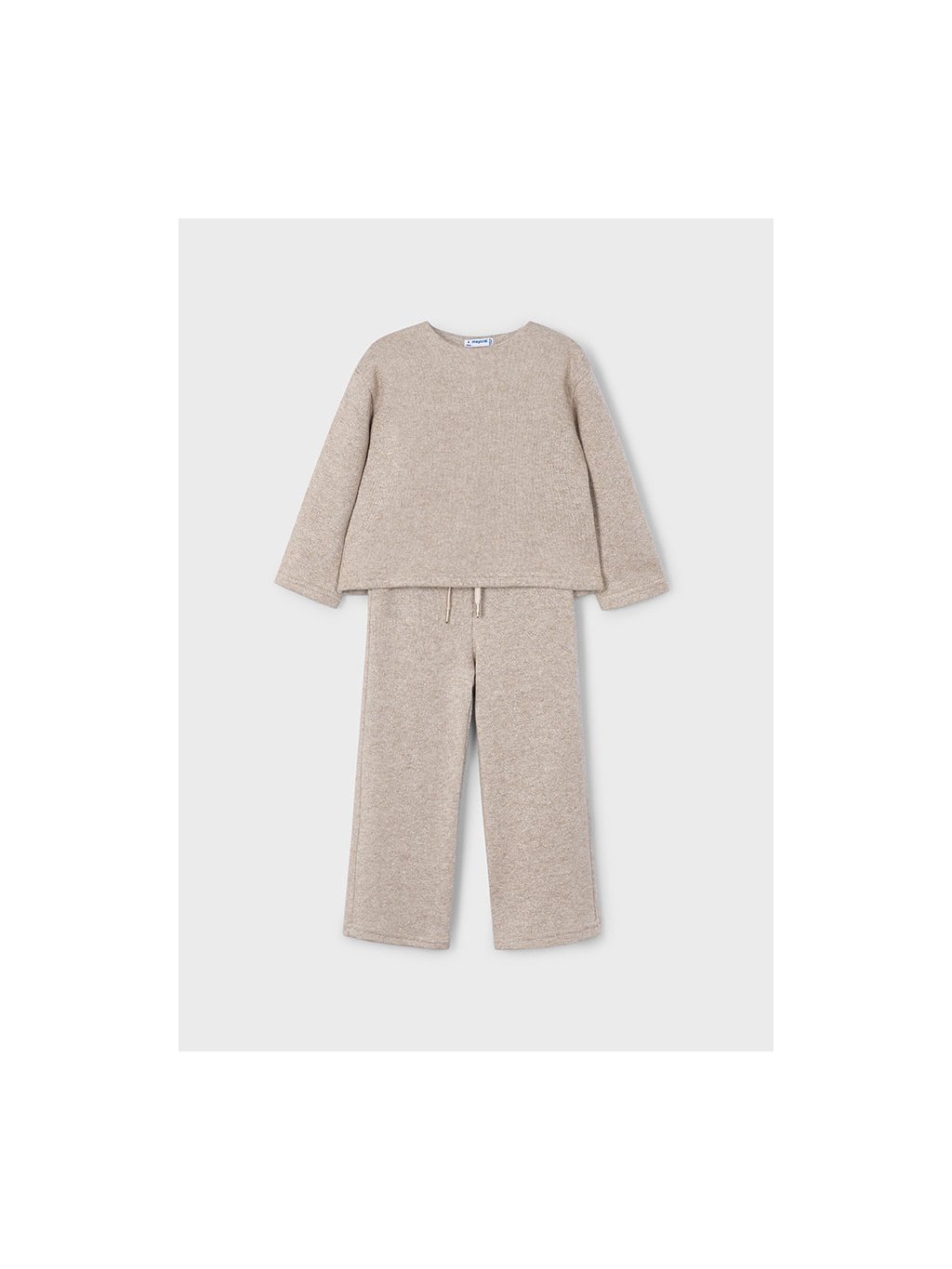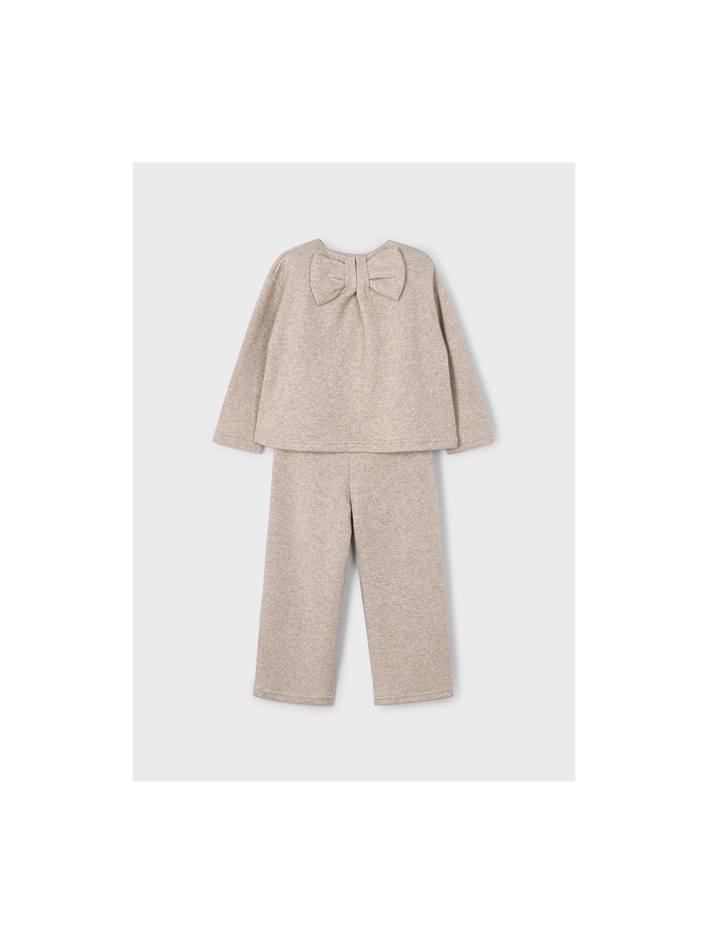 Mayoral dívčí třpytivá souprava svetru a kalhot. Oba kousky jsou z velmi příjemného úpletu. Svetr má u krku kulatý výstřih, na zadní straně je aplikace mašle. Kalhoty jsou volnějšího střihu, v pase mají pružnou gumu.
