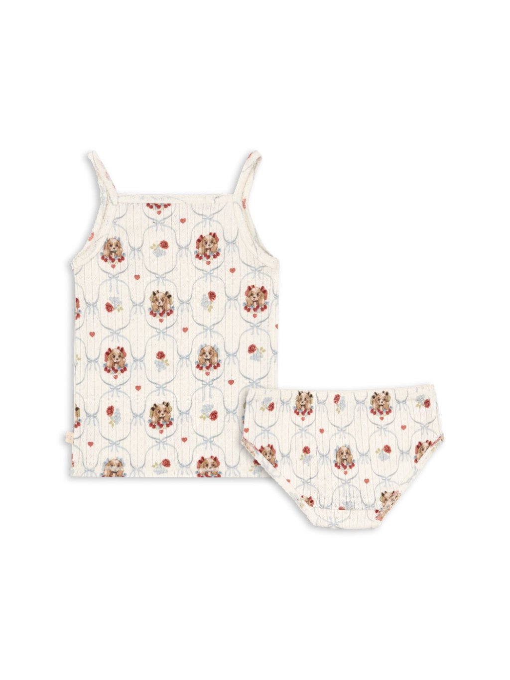 Dívčí dvoudílná sada spodního prádla, tílka se špagetovými ramínky a kalhotkami. Oba kousky jsou z velmi příjemné, měkkého materiálu, 100% organické bavlny.