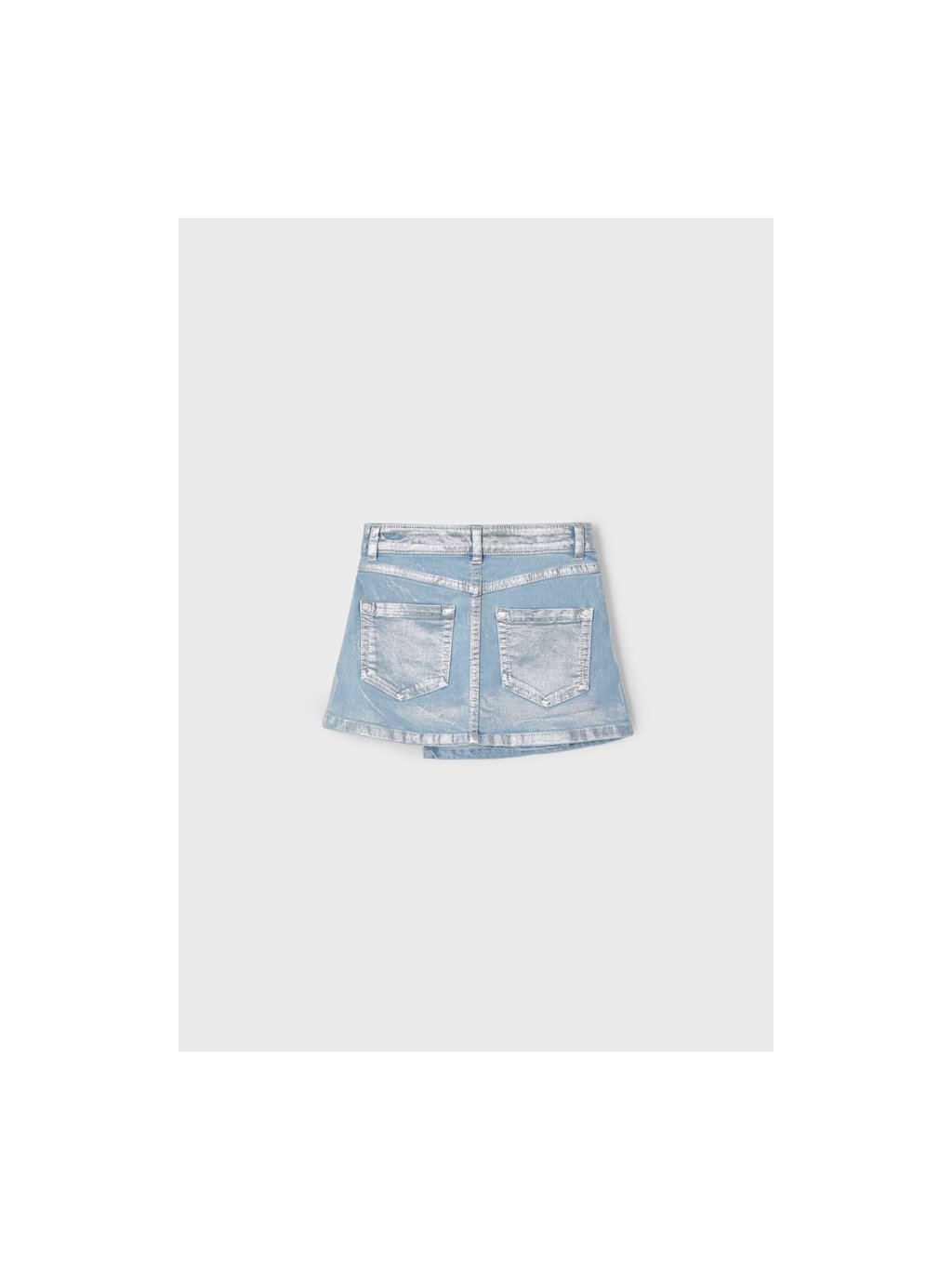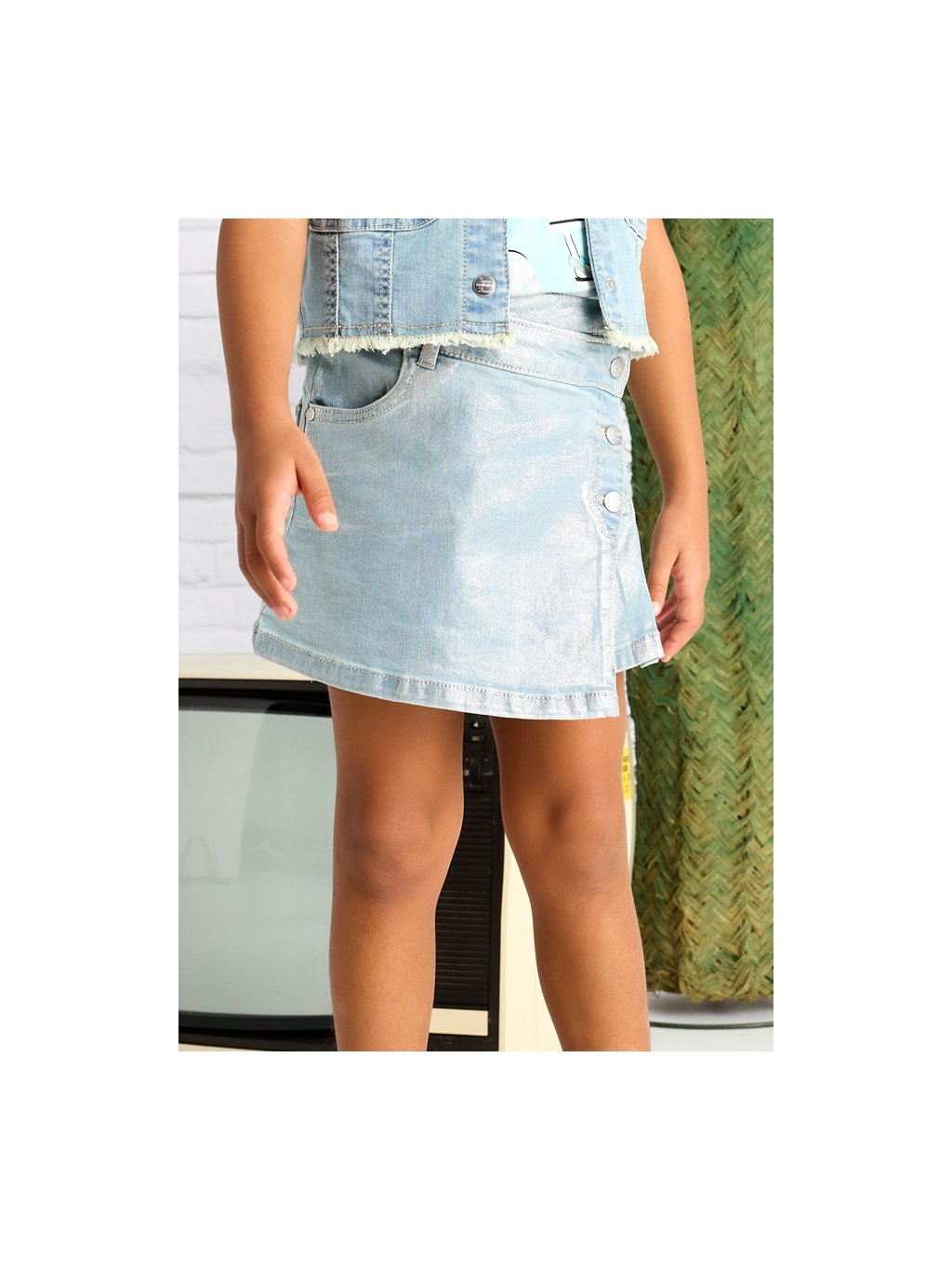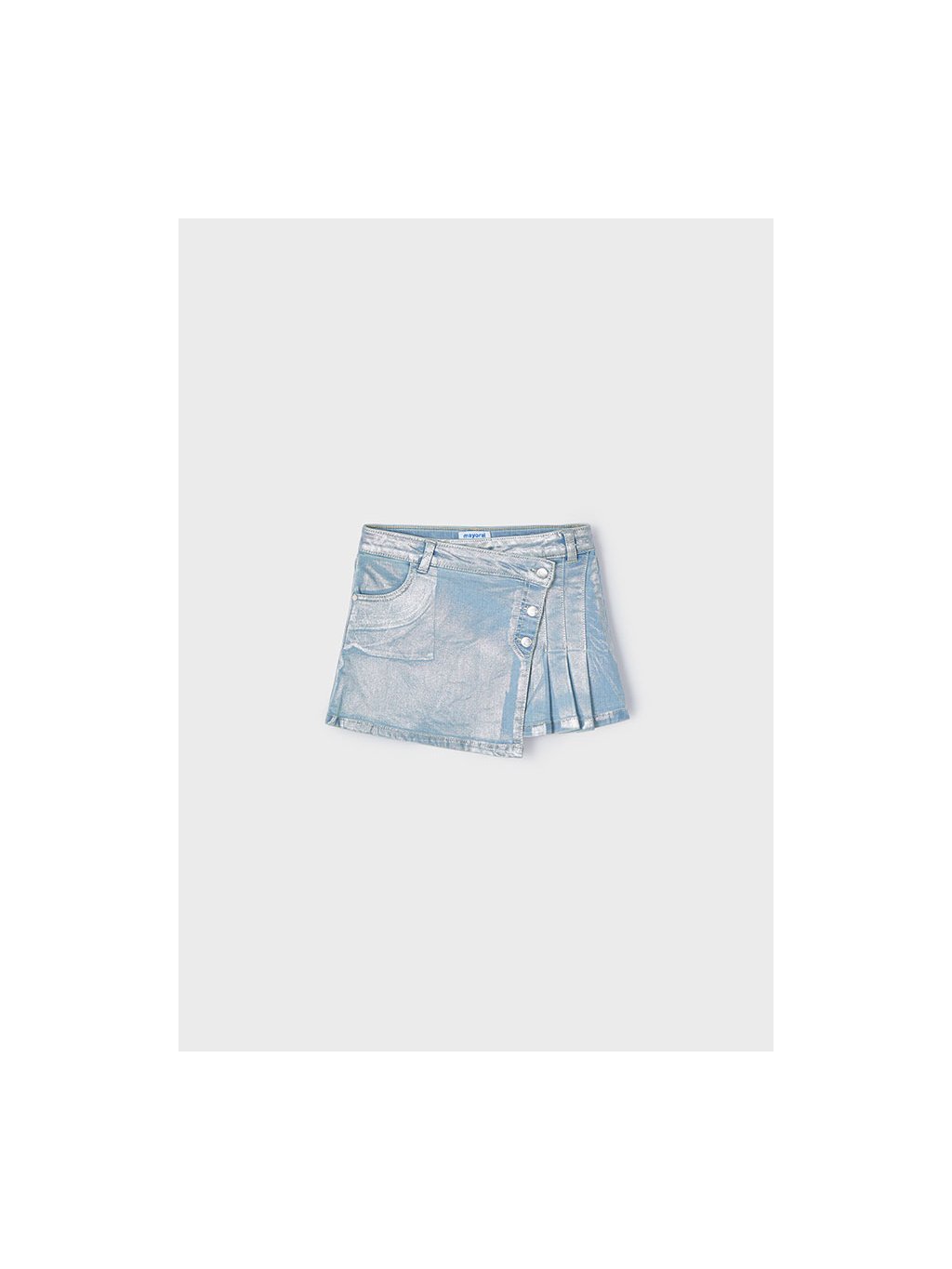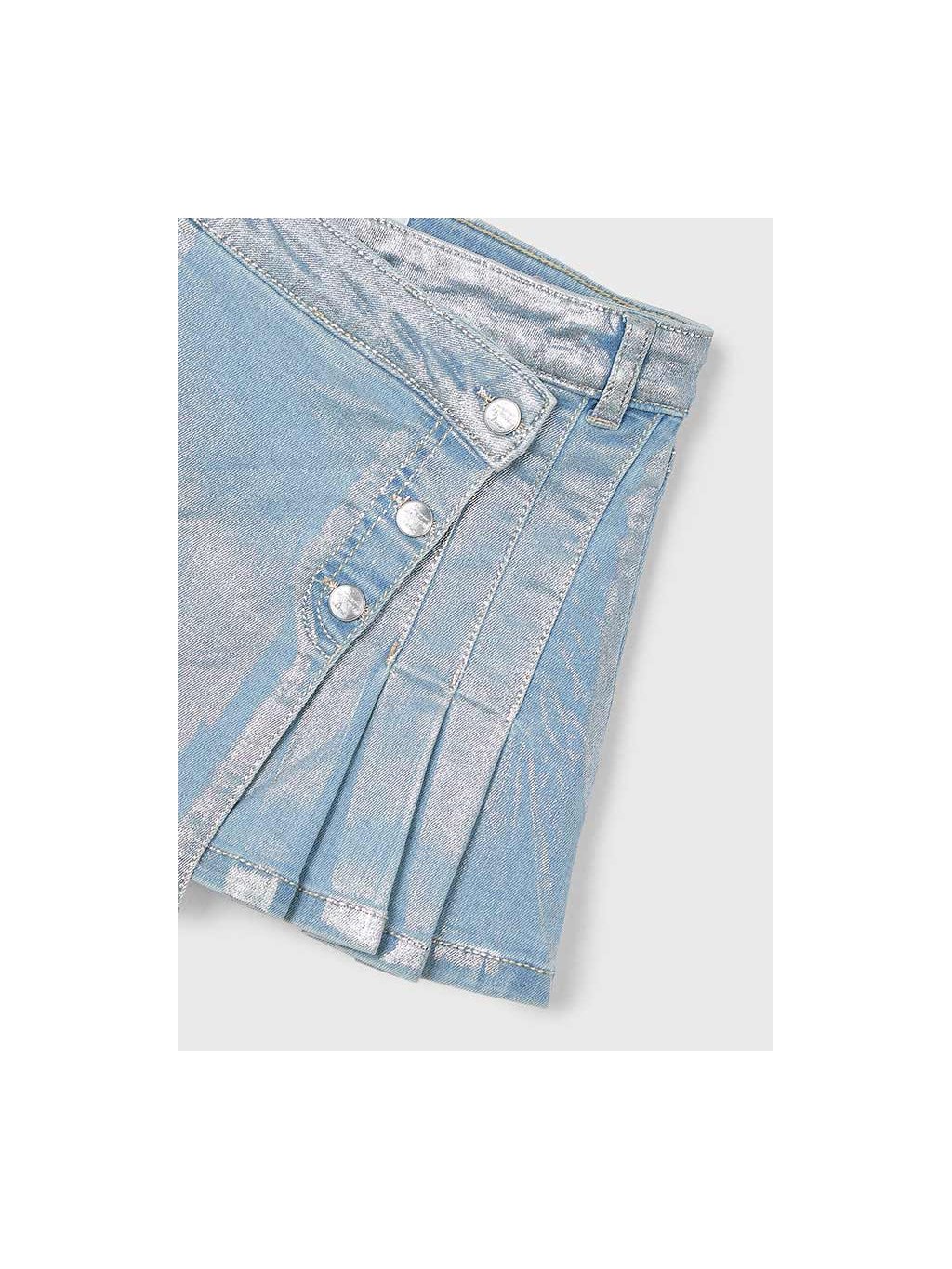 Mayoral dívčí riflová sukně se zapínáním na cvoky a metalickým stříbrným efektem. Sukně je z velmi příjemné, měkké a odlehčené rifloviny, zapínání pouze na cvoky. V pase jsou regulační gumičky, na přední i zadní straně jsou funkční kapsy.