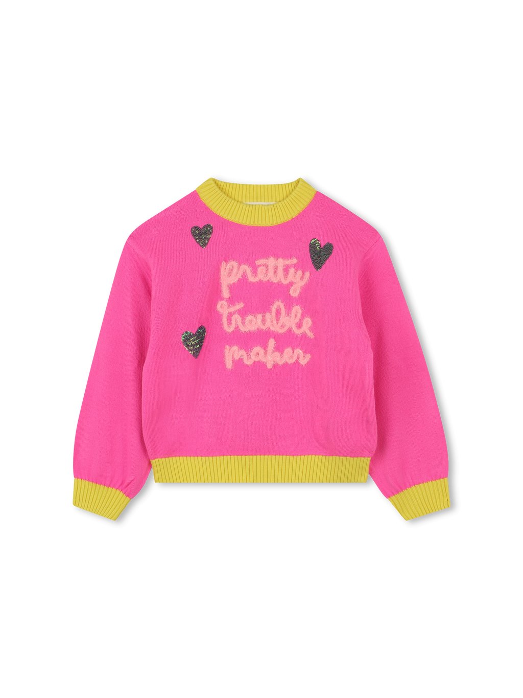 Dívčí svítivě růžový svetýrek s nápisem a aplikcemi.
