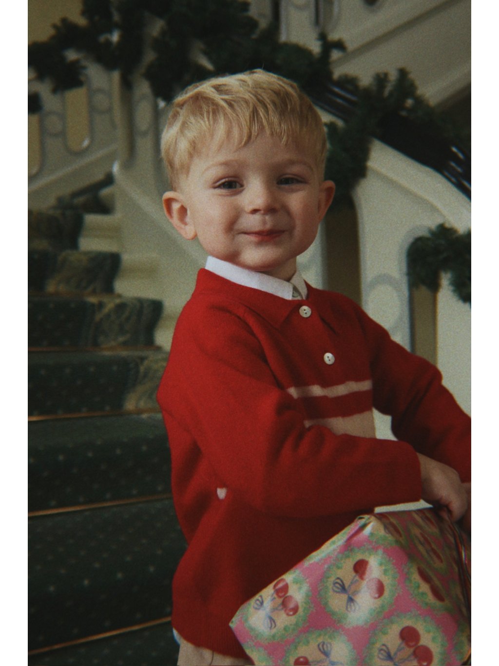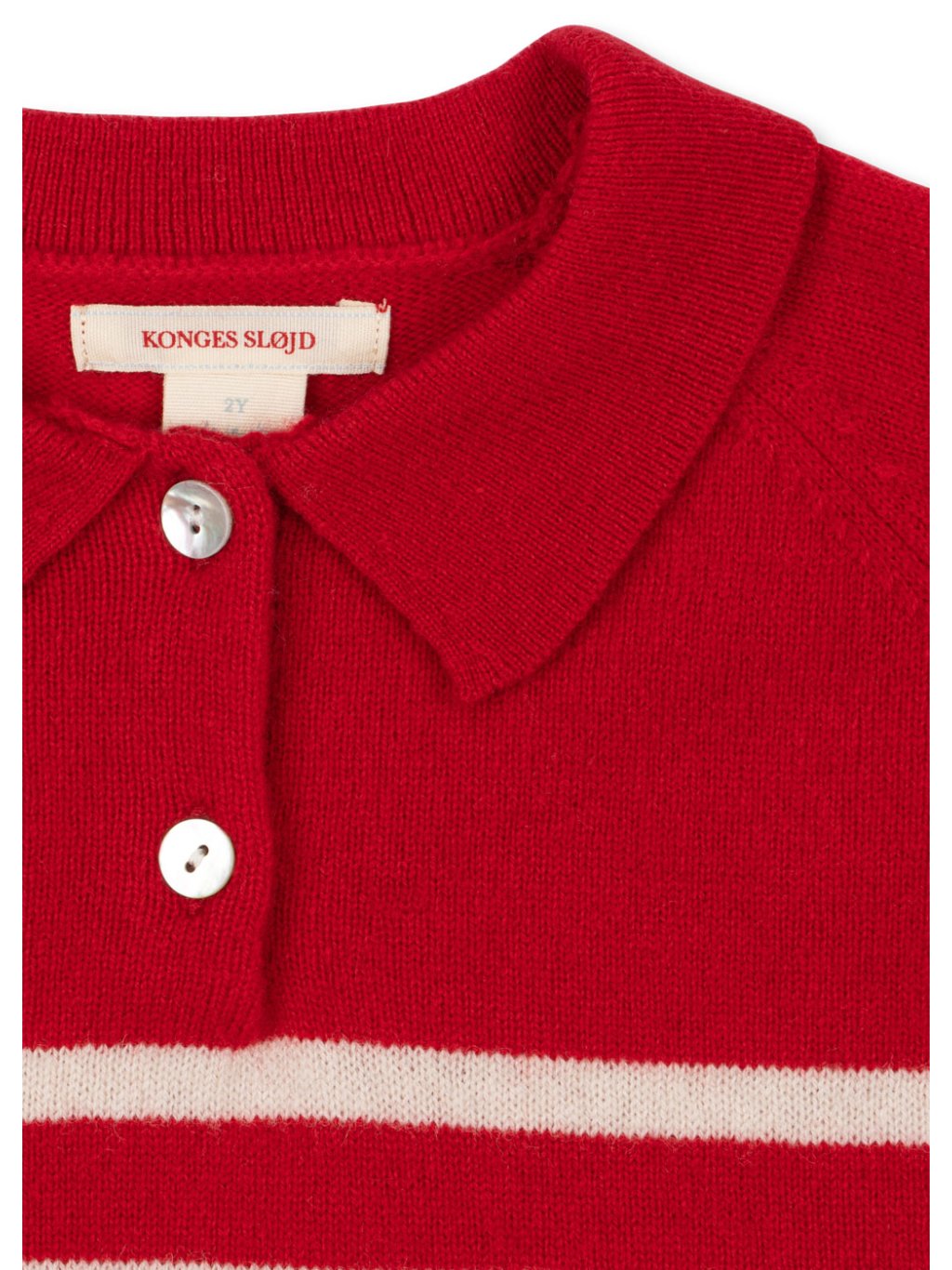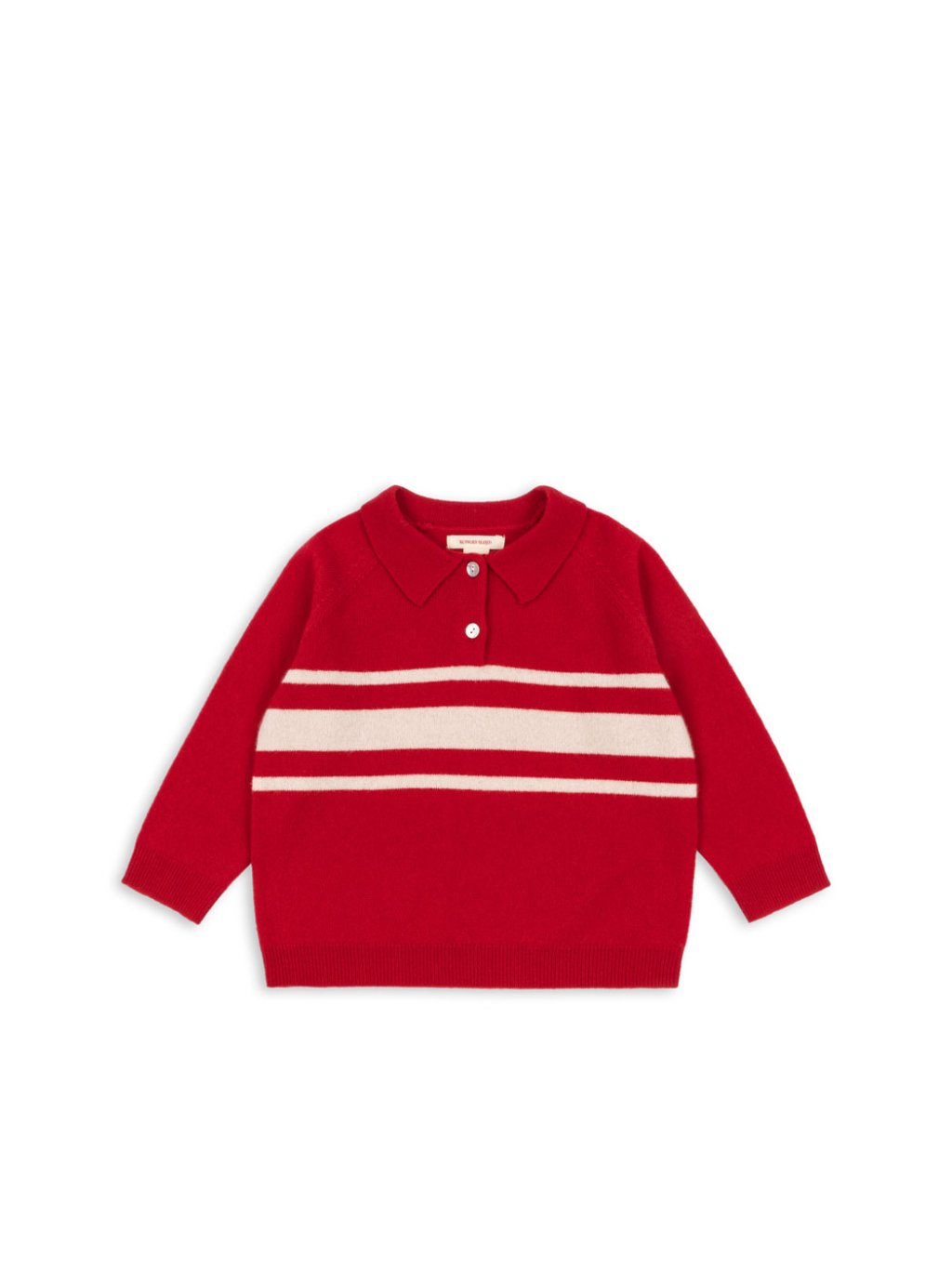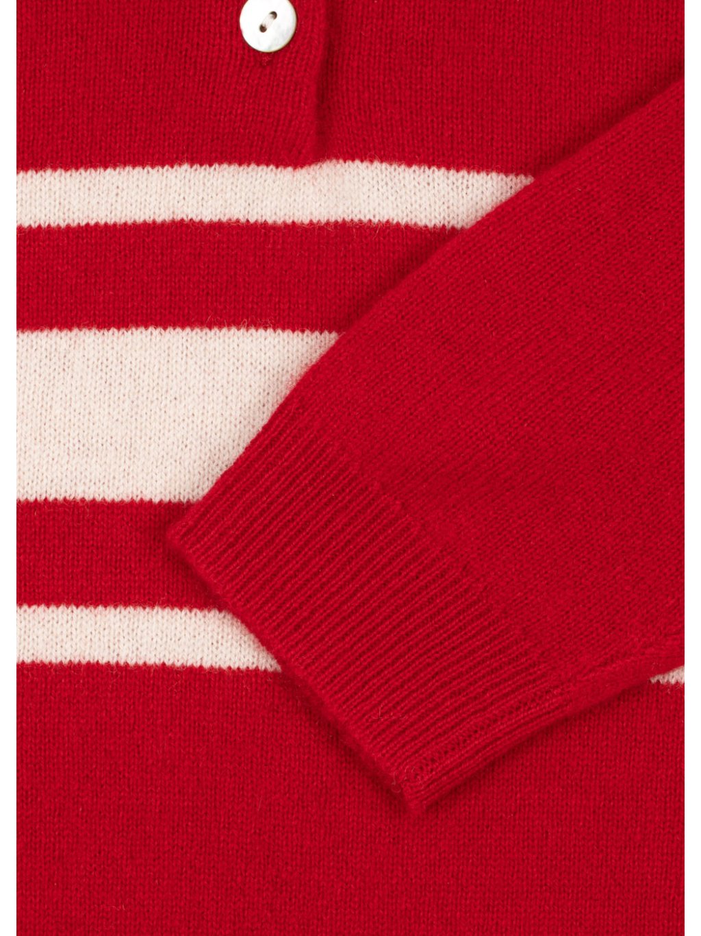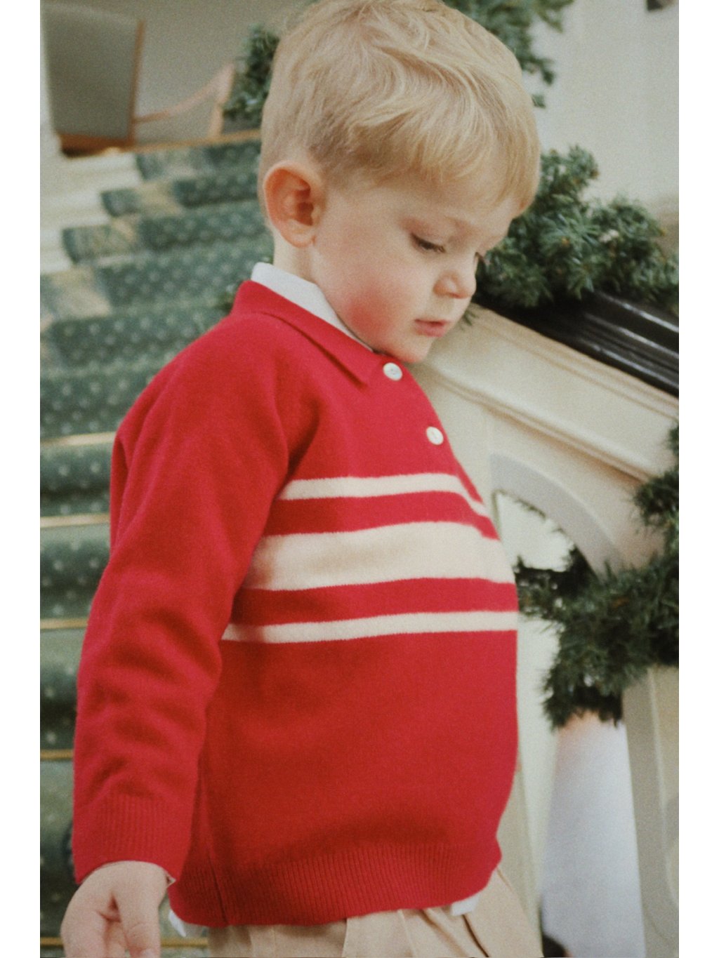 Měkký, příjemný vlněný svetýrek s límečkem. Svetr má u krku kulatý výstřih a zapínání na knoflíčky.