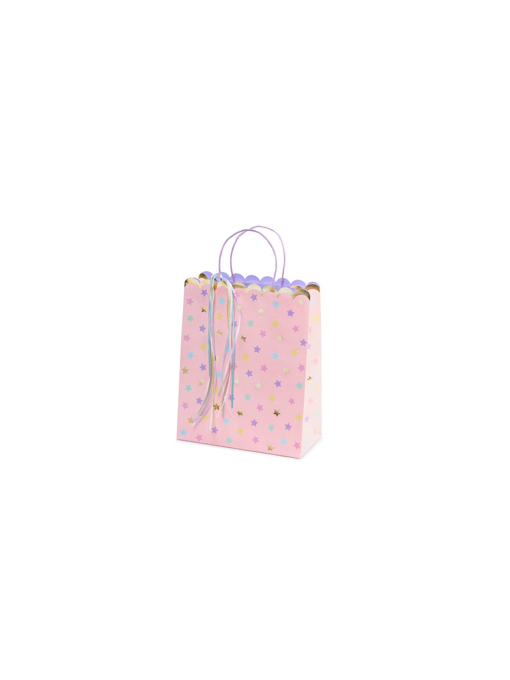 Dárková papírová taška s motivem hvězdiček a látkovými střapci. Rozměry bez uch 26 x 32 x 13 cm.