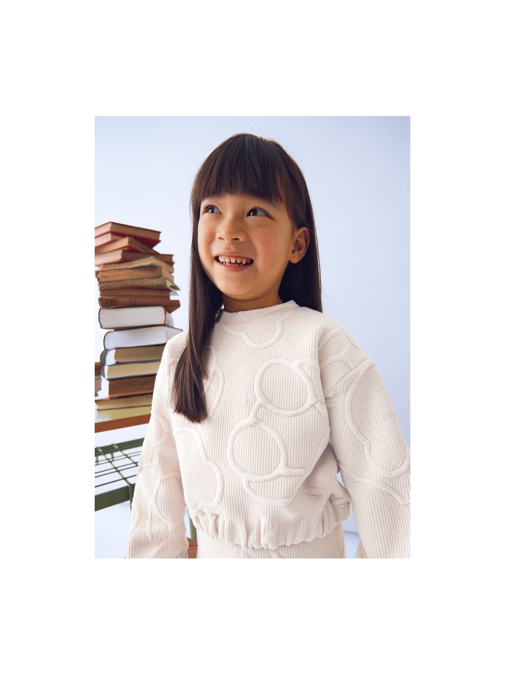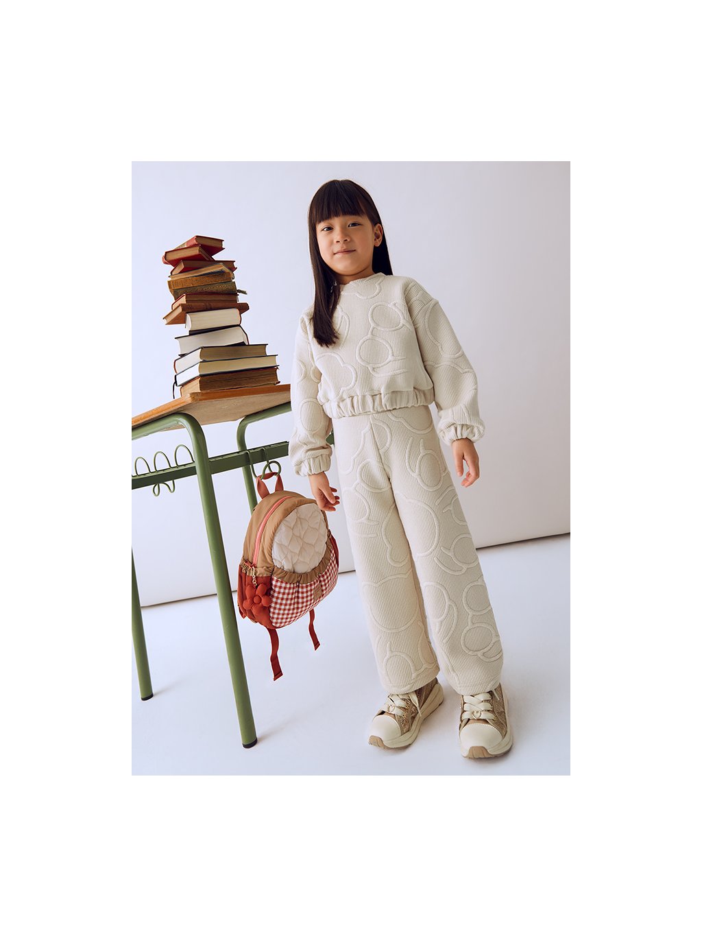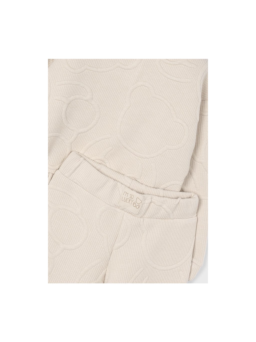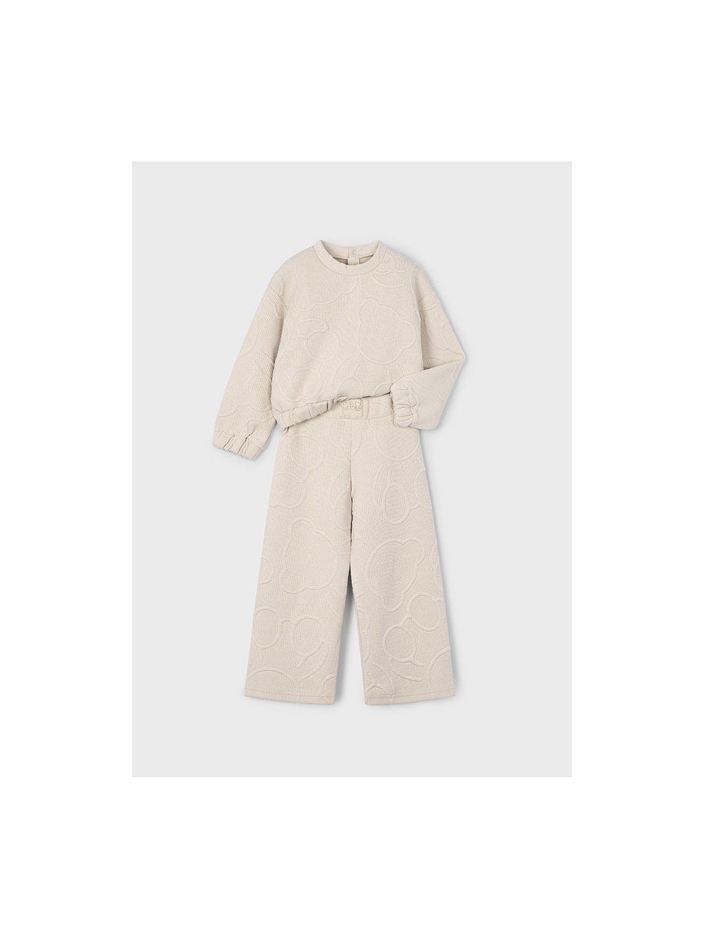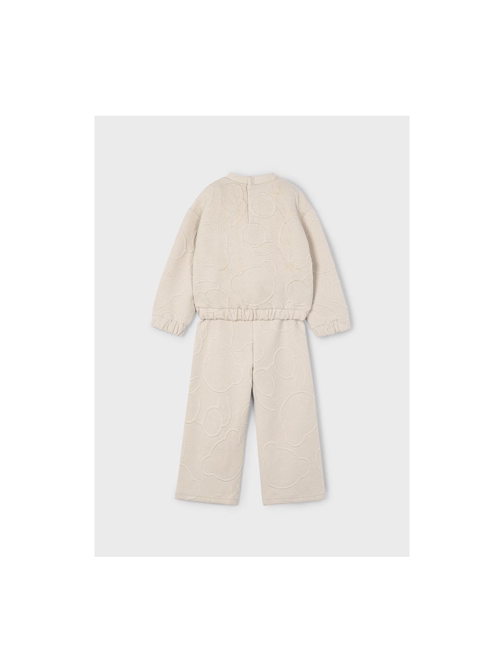 Mayoral dívčí souprava mikiny a tepláků. Celá souprava je z velmi příjemného, a pohodlného materiálu. Mikina je bez kapuce, v pase a na rukávech je obšitá guma. Tepláky mají v pase měkkou, pružnou gumu, která nijak netlačí. Střih tepláků je spíše zvonový, volnější. Po celé ploše teplákové soupravy jsou obrysy hlav medvídků.