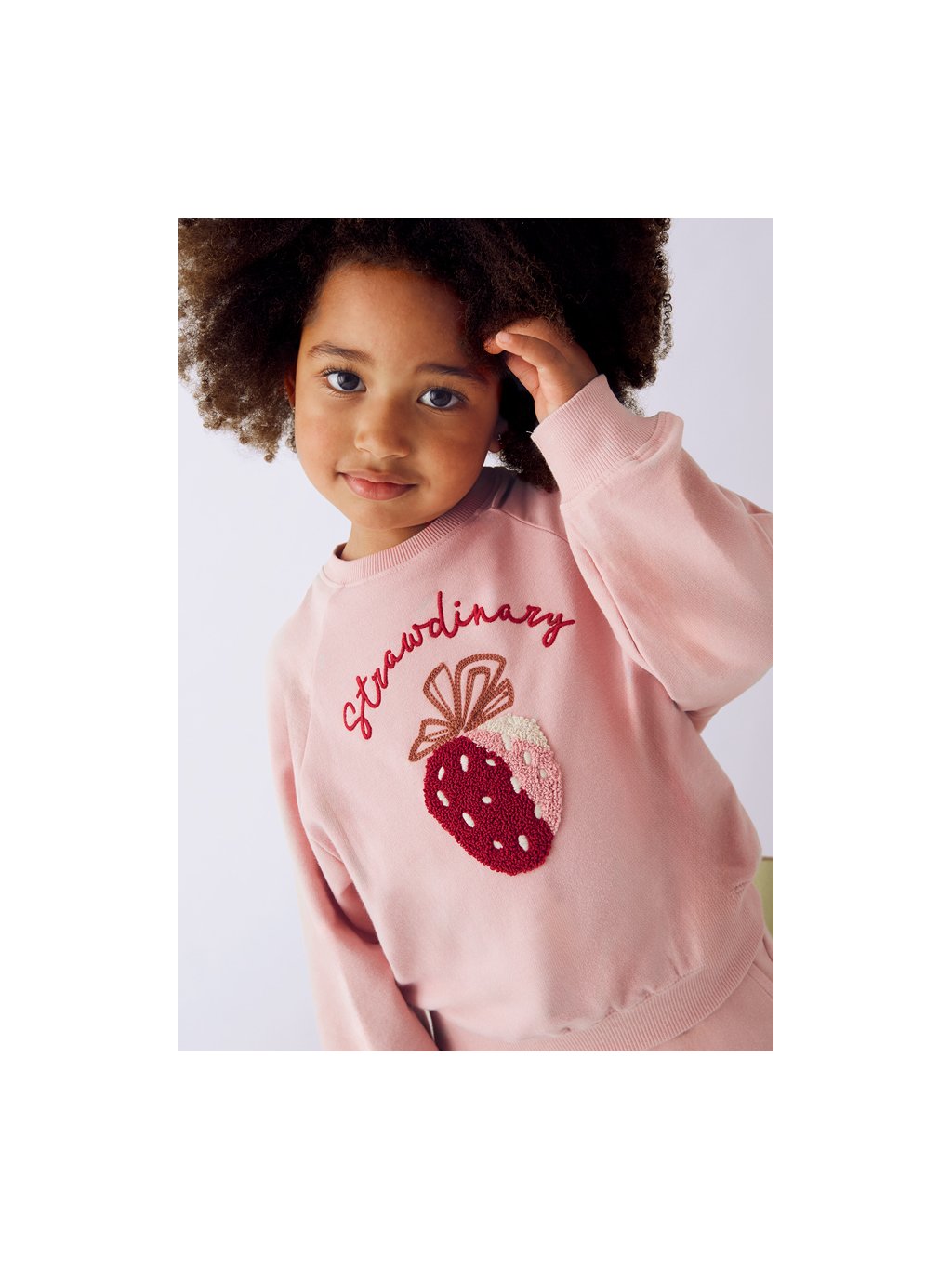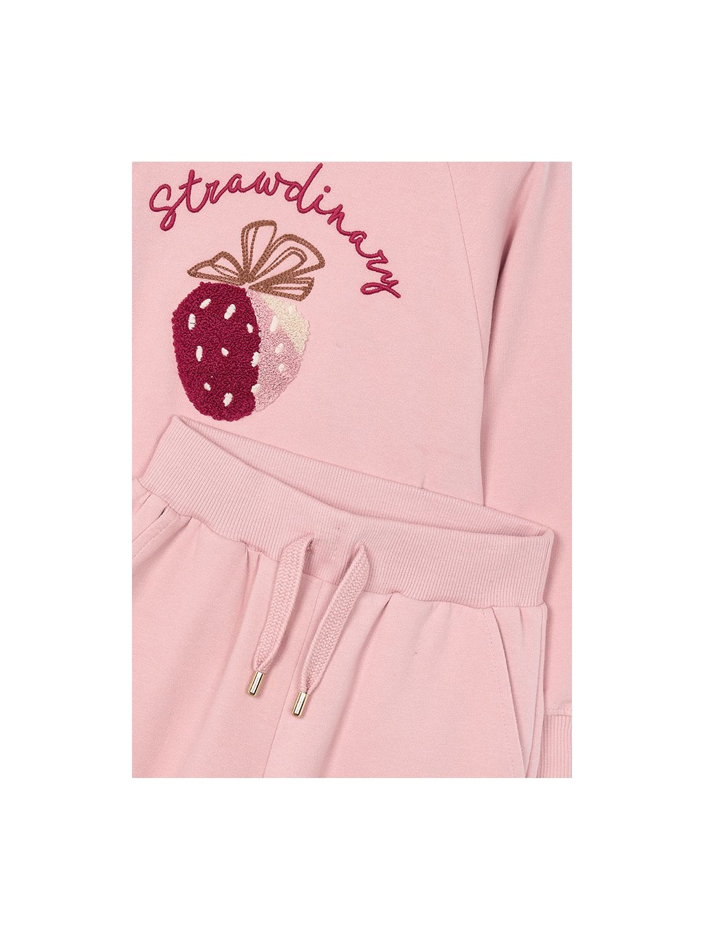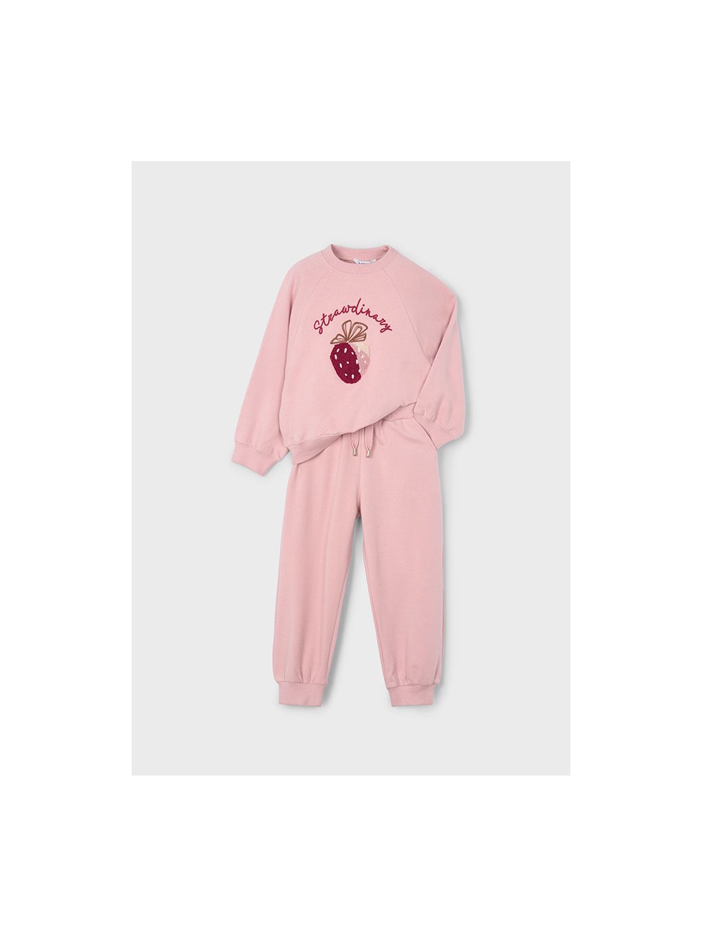 Mayoral dívčí bavlněná souprava mikiny a tepláků. Celá souprava je z velmi příjemného, a pohodlného teplákového materiálu. Mikina bez kapuce má na přední straně aplikaci jahůdky. Tepláky mají v pase měkkou, pružnou gumu, která nijak netlačí. Na přední straně jsou 2 funkční kapsy.