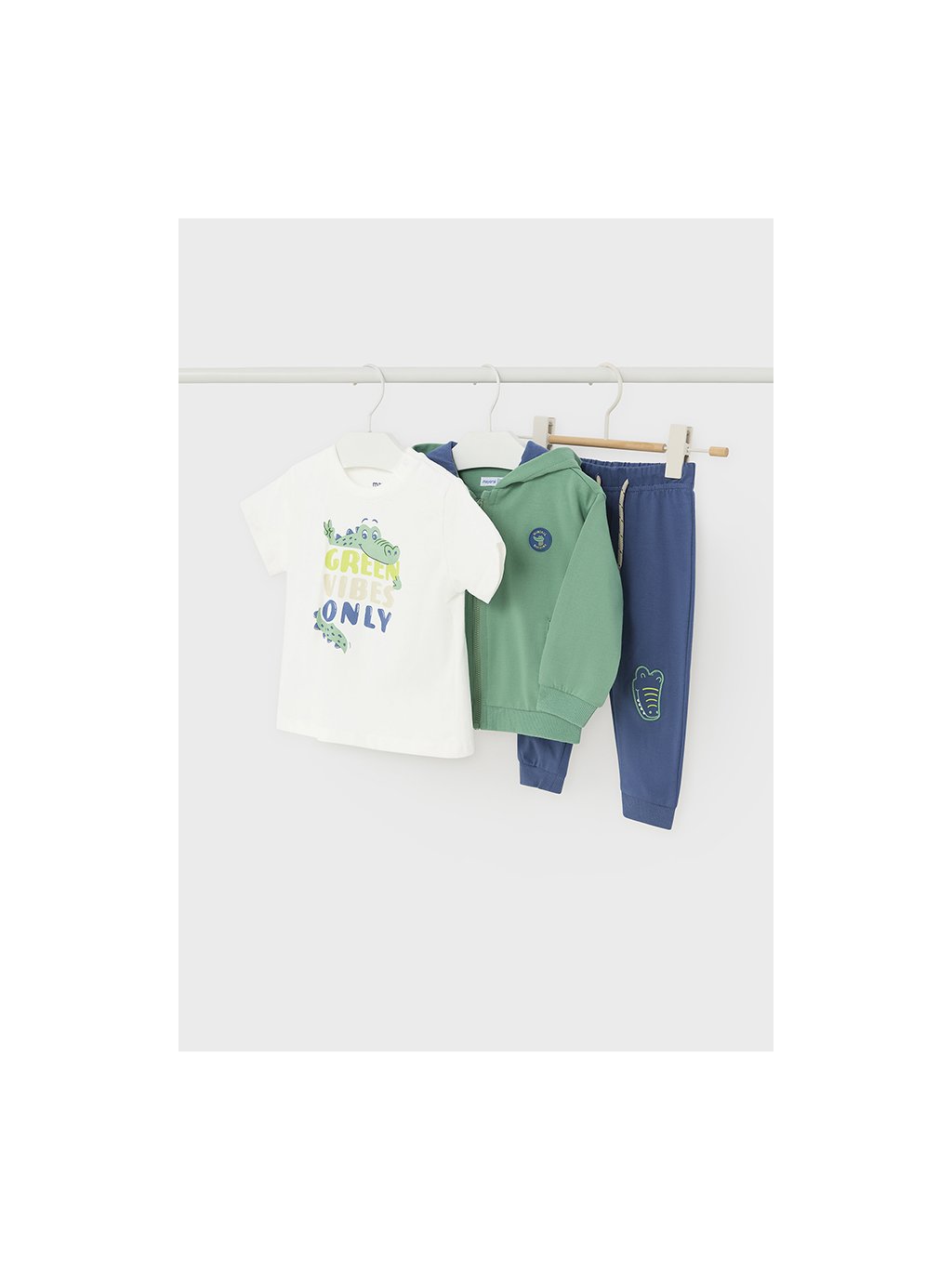 Mayoral chlapecká tepláková souprava. Tepláková souprava obsahuje mikinu, tričko, a tepláky. Celá souprava je z velmi příjemného bavlněného materiálu. Tričko má na přední straně tisk, a u krku zapínání na patenty. Mikina je na zapínání na zip. Tepláky mají na kolenou motiv krokodýla.