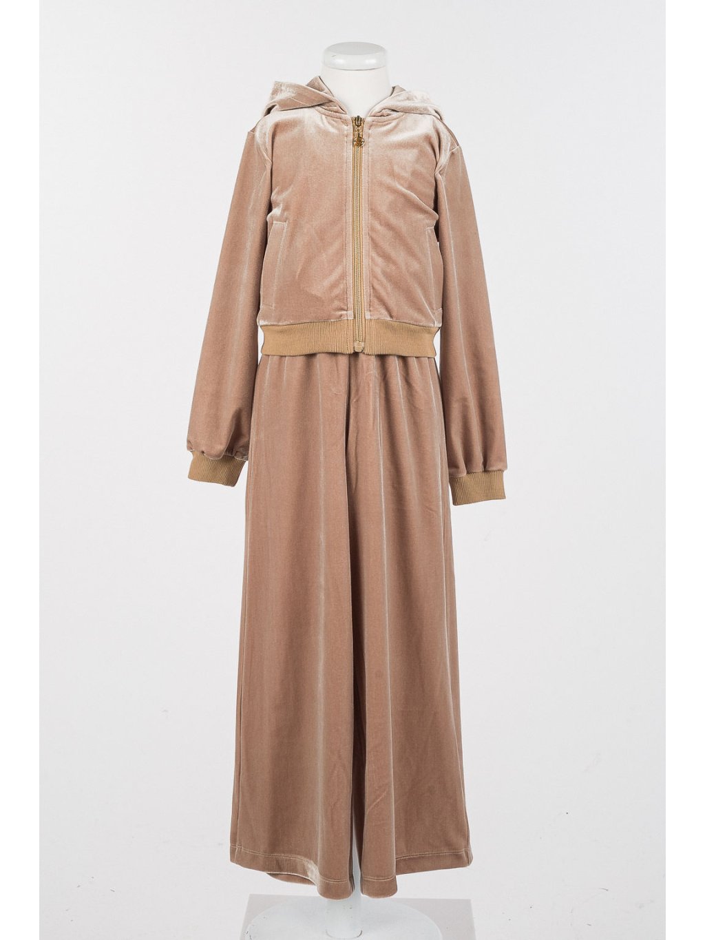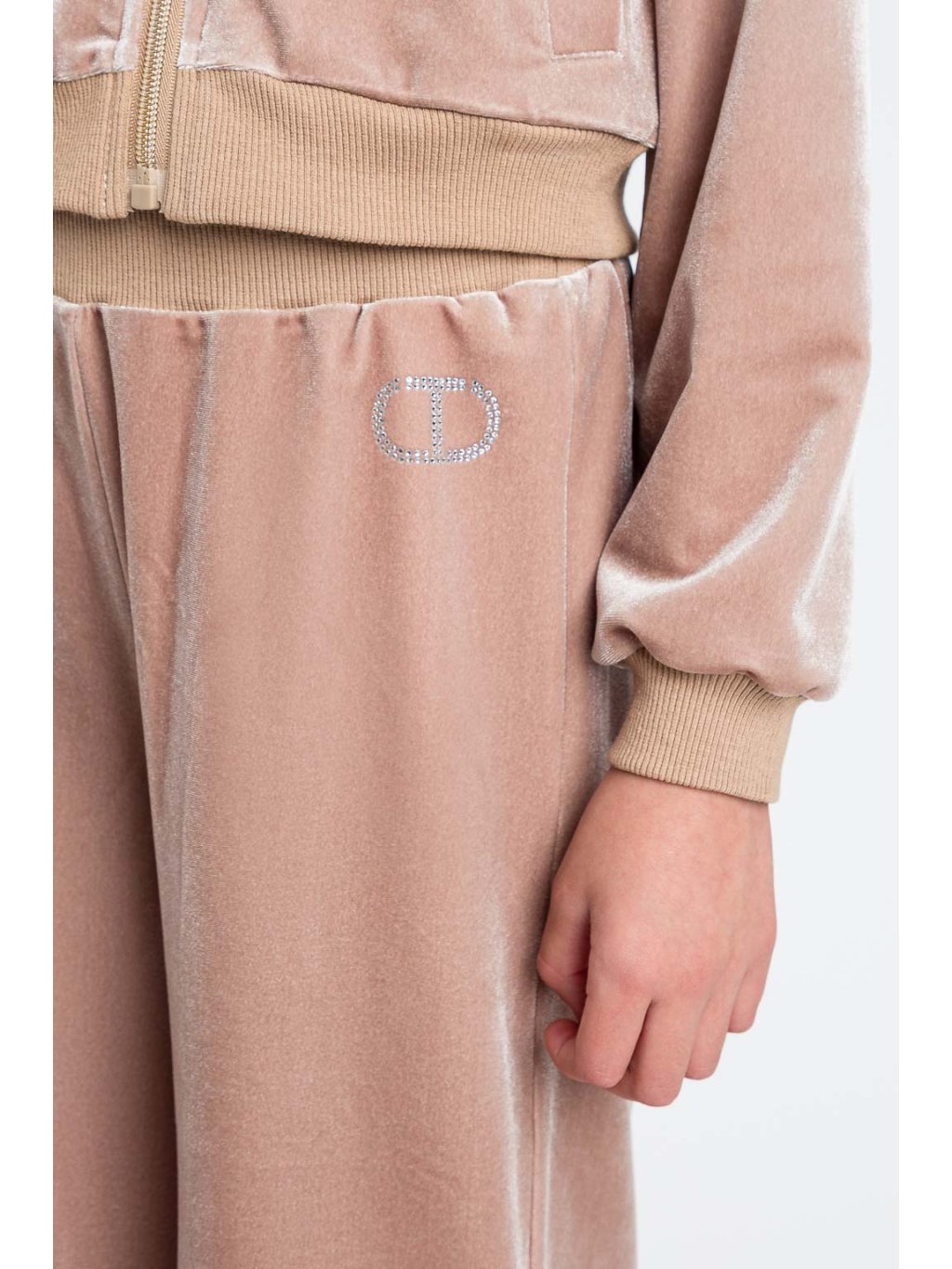 Luxusní dívčí tepláková sametová souprava. Oba kousky jsou z velmi příjemného materiálu. Tepláky mají vyšší pas, mikina je kratší délky! Mikina má na zadní straně aplikaci loga z třpytivých kamínků. Každý kus lze nosit zvlášť, dohromady vypadají však nejlépe.