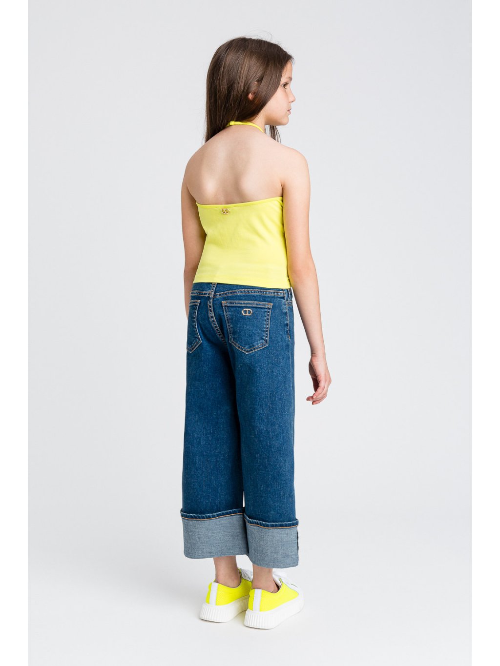 Dívčí bavlněné tílko s ramínkem za krk. Tílko je z velmi příjemného, pružného materiálu, Na přední straně je aplikace látkových květin, na zadní straně je decentní zlaté logo.