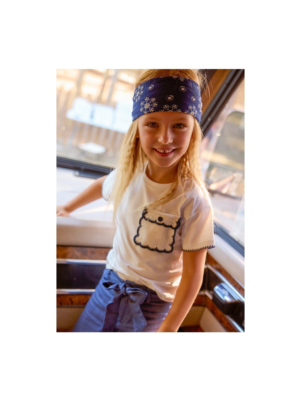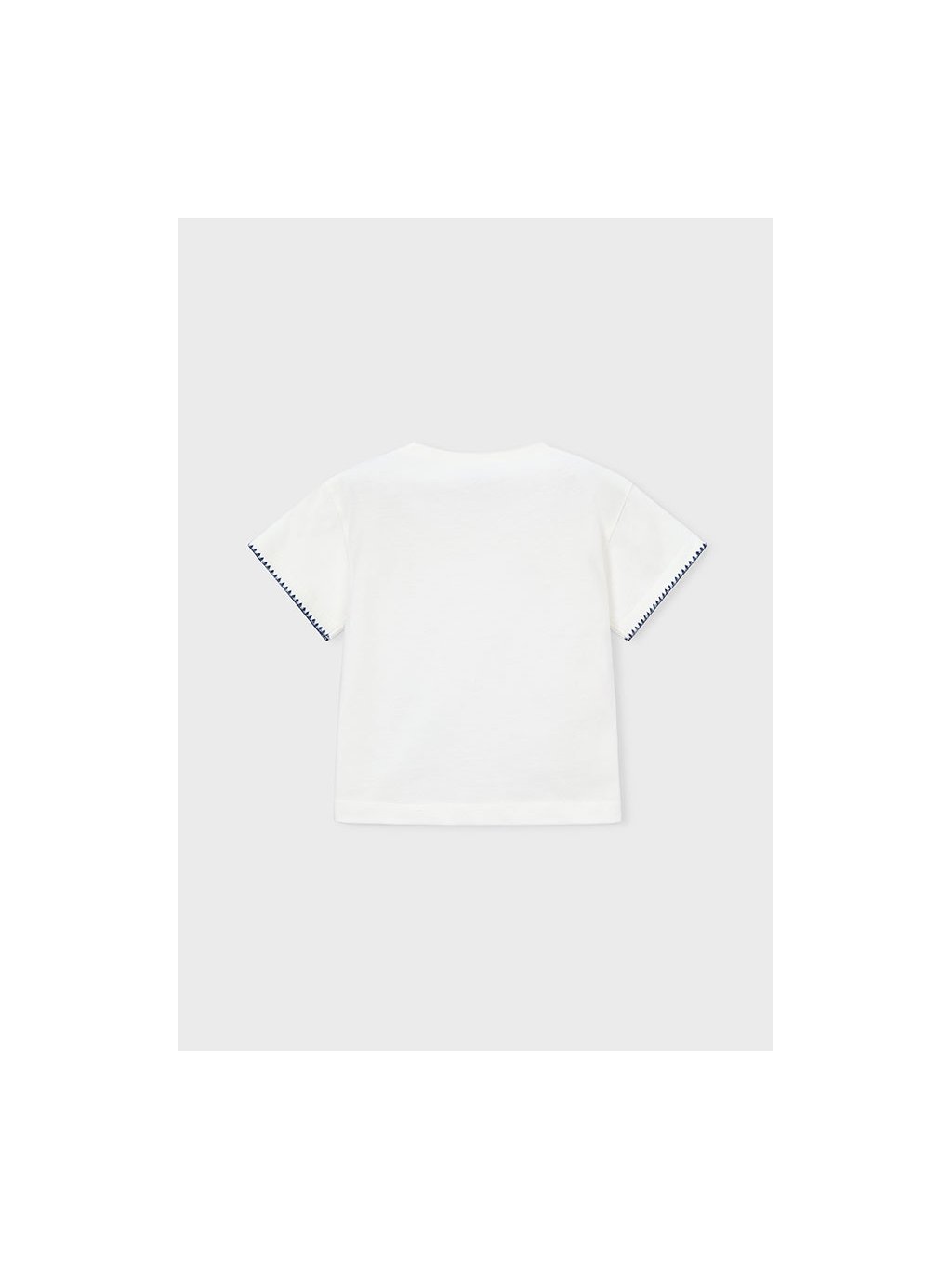 Mayoral dívčí bavlněné tričko s krátkým rukávem a háčkovanou kapsičkou. Tričko je z velmi příjemného bavlněného materiálu, u krku má kulatý výstřih. Na přední straně, na levém prsu je háčkovaná kapsa. Lem rukávů má háčkovanou aplikaci.