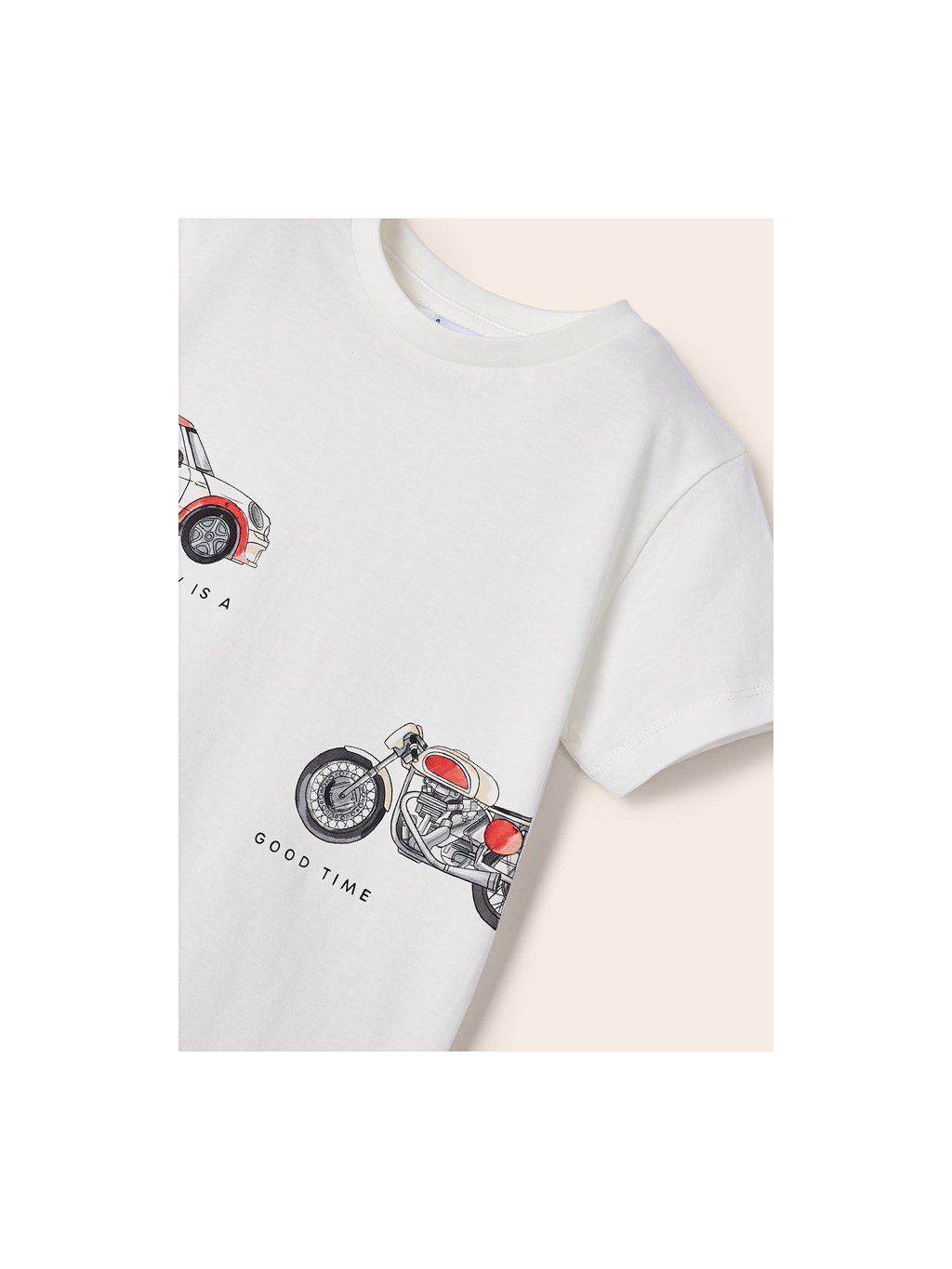 Mayoral chlapecké bavlněné tričko s krátkým rukávem tiskem. Tričko je z velmi příjemného bavlněného materiálu, a u krku má kulatý výstřih. Tričko má na přední straně potisk aut, motorky, a nápisů.