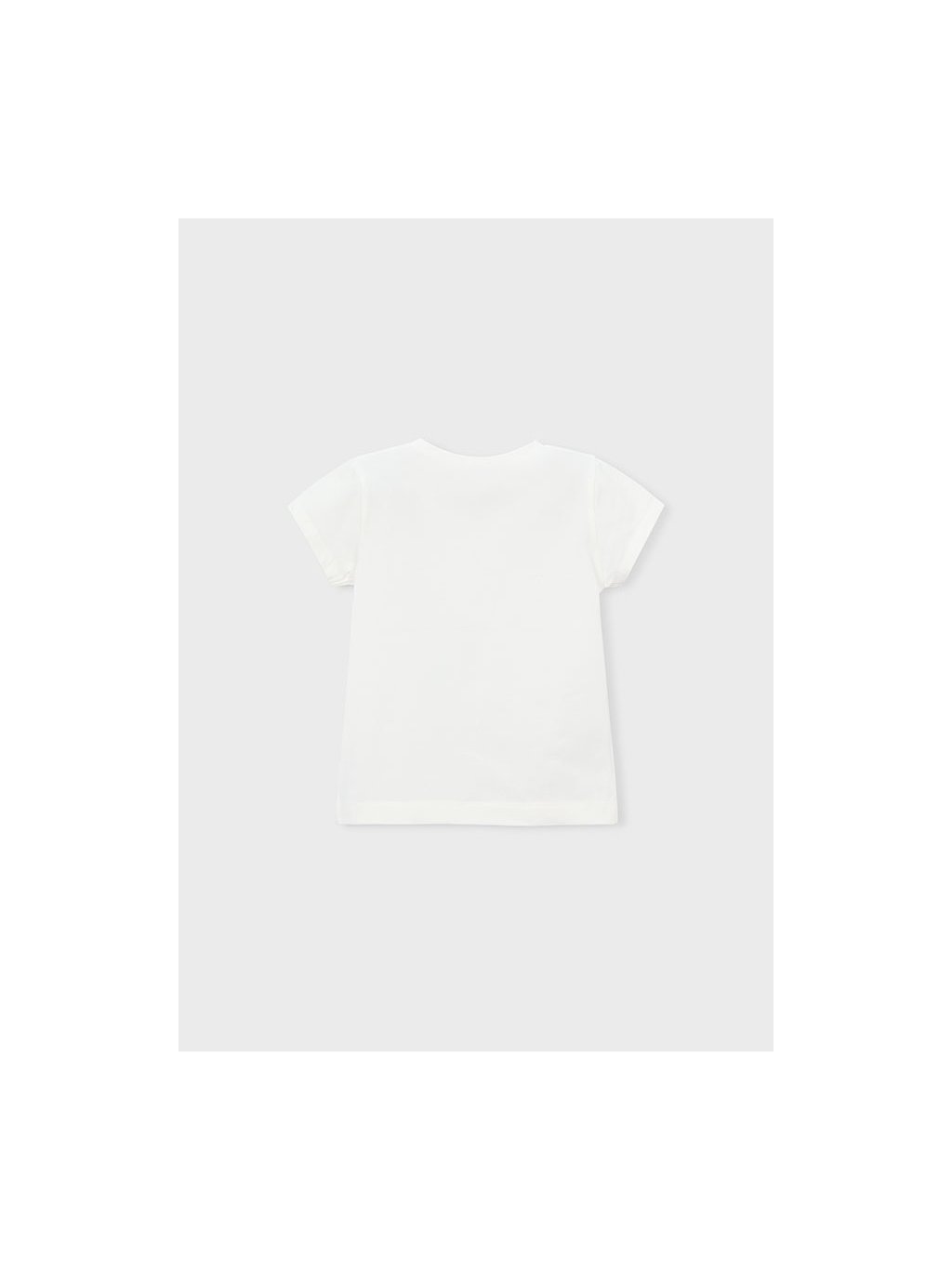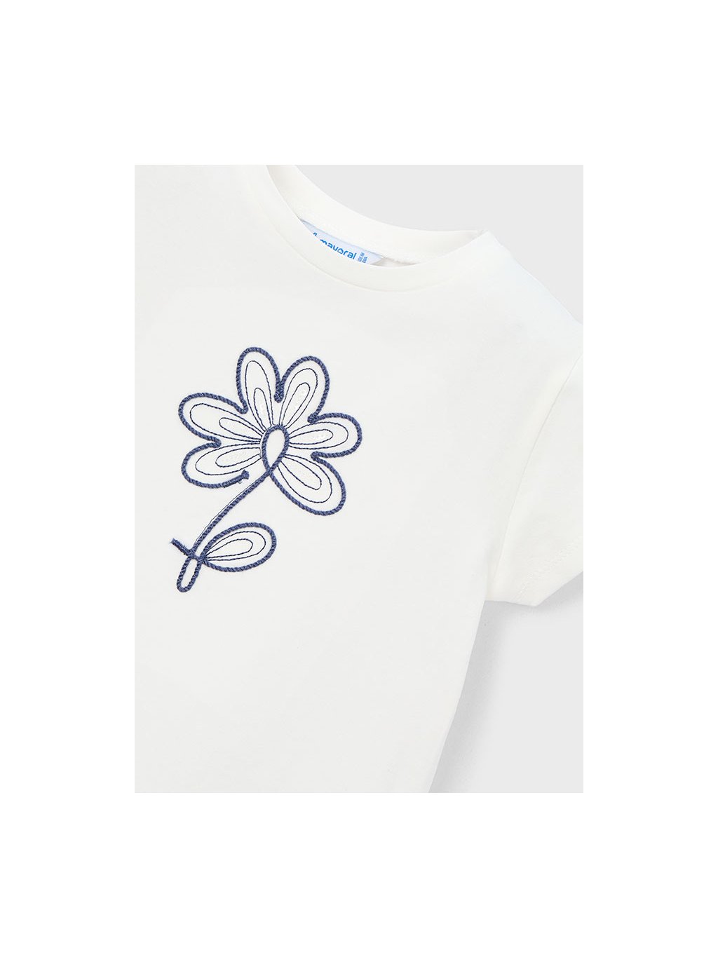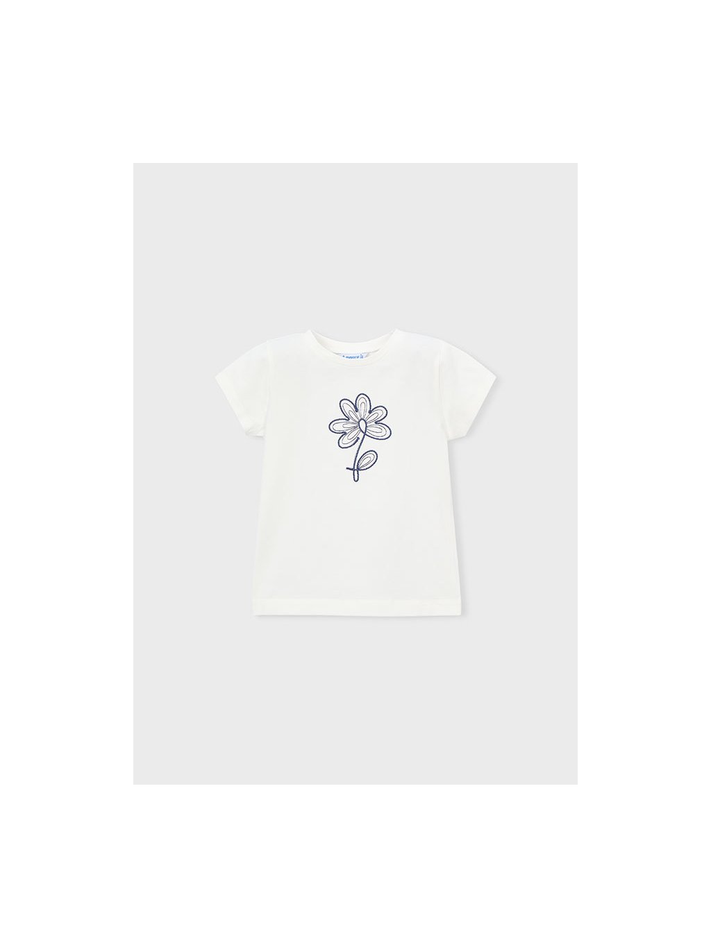 Mayoral dívčí tričko s krátkým rukávem a výšivkou. Tričko je z velmi příjemného bavlněného materiálu, u krku má kulatý výstřih. Tričko má na přední straně modrou aplikaci kytičky.