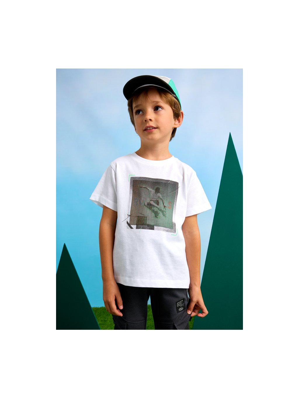 Mayoral chlapecké bavlněné tričko s krátkým rukávem a měnící aplikací. Tričko je z velmi příjemného bavlněného materiálu, a u krku má kulatý výstřih. Na přední straně uprostřed má měnící aplikaci.