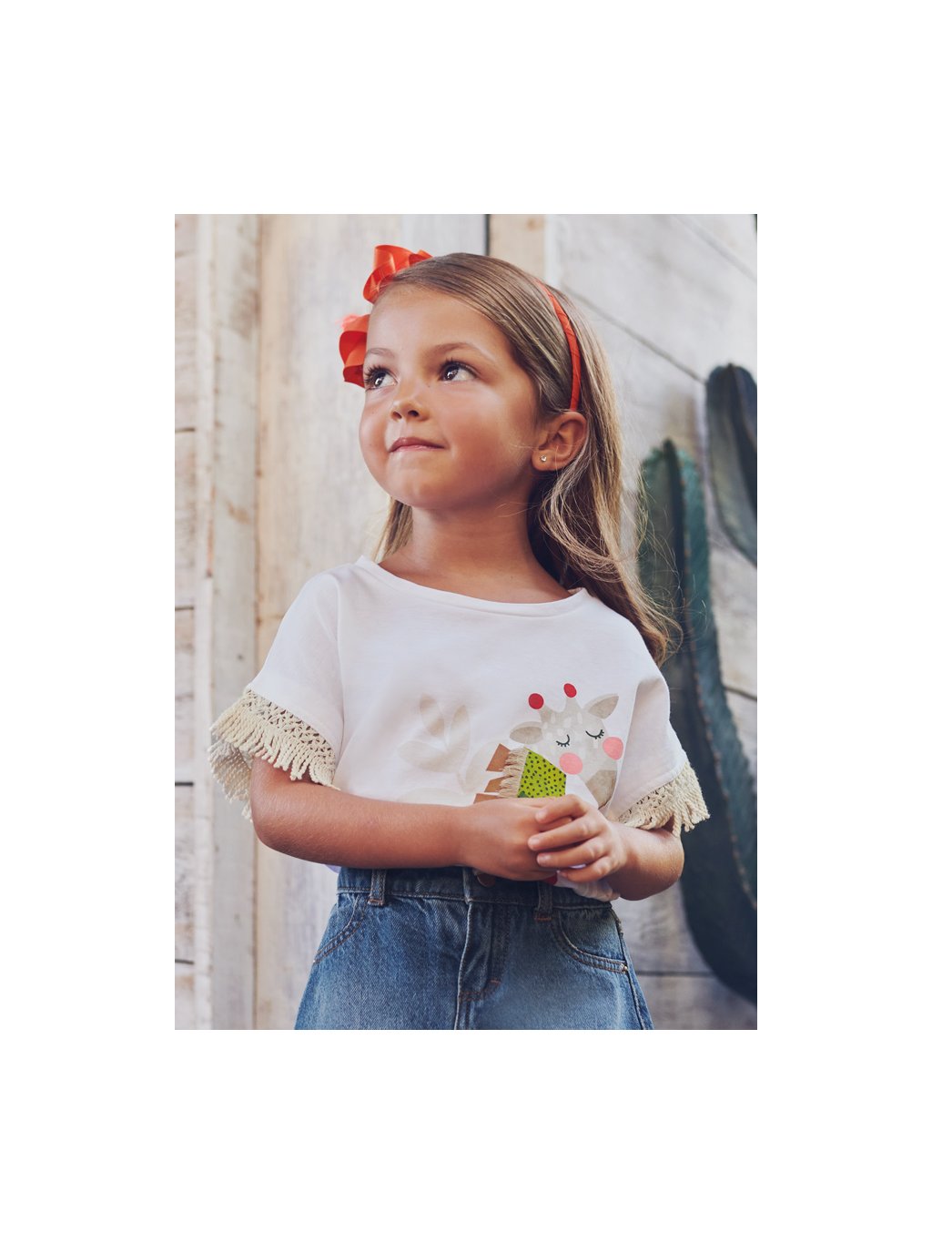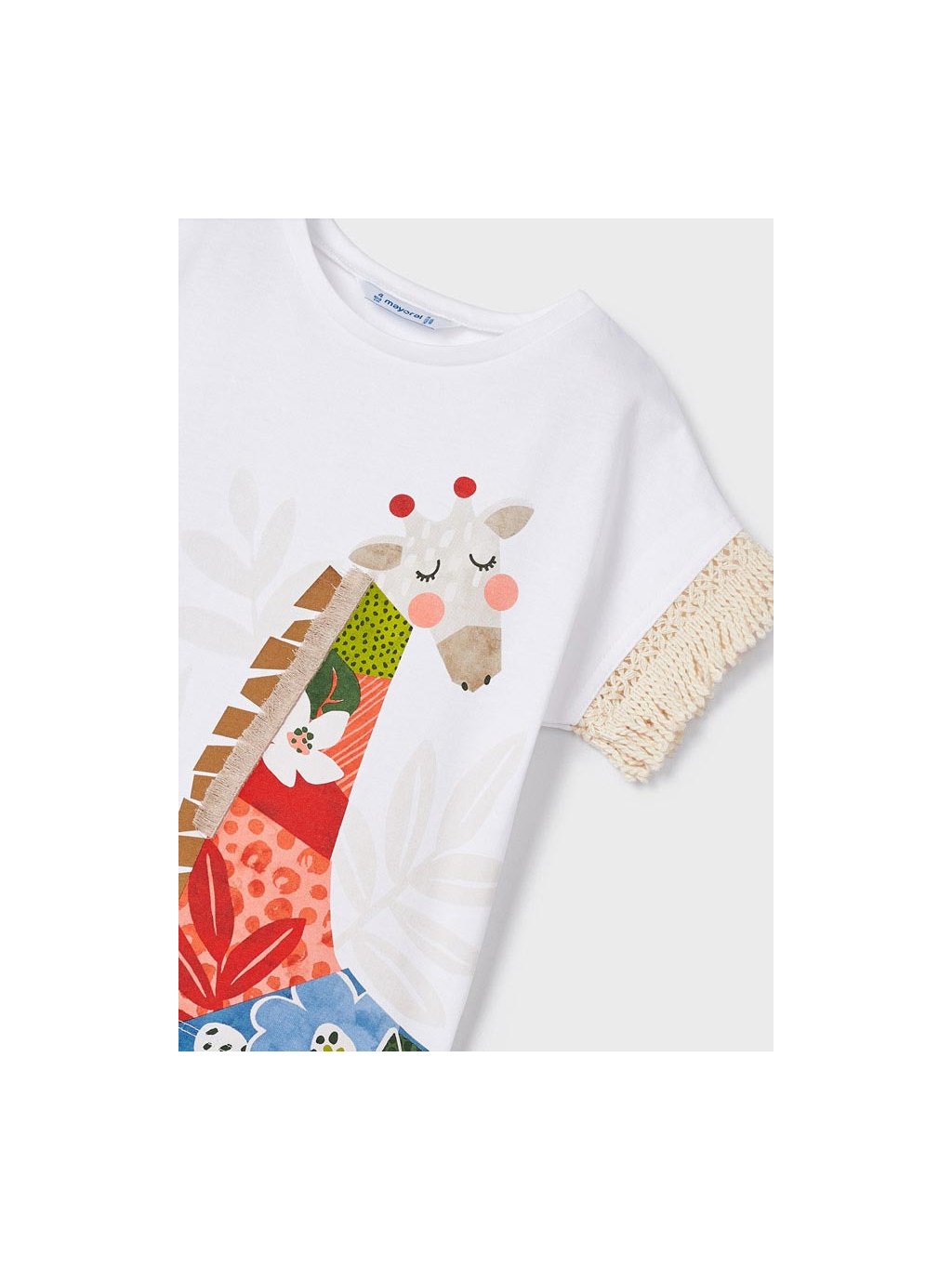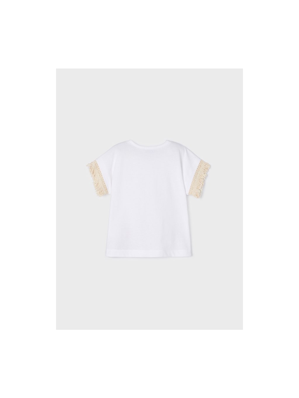 Mayoral dívčí tričko s krátkým rukávem s třásněmi a tiskem. Tričko je z velmi příjemného bavlněného materiálu, a u krku má kulatý výstřih. Trčiko má na rukávech třásně, a na přední straně potisk s třásněmi.