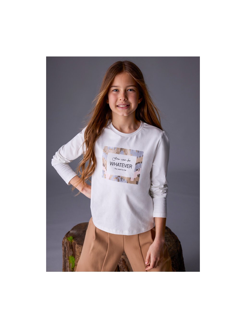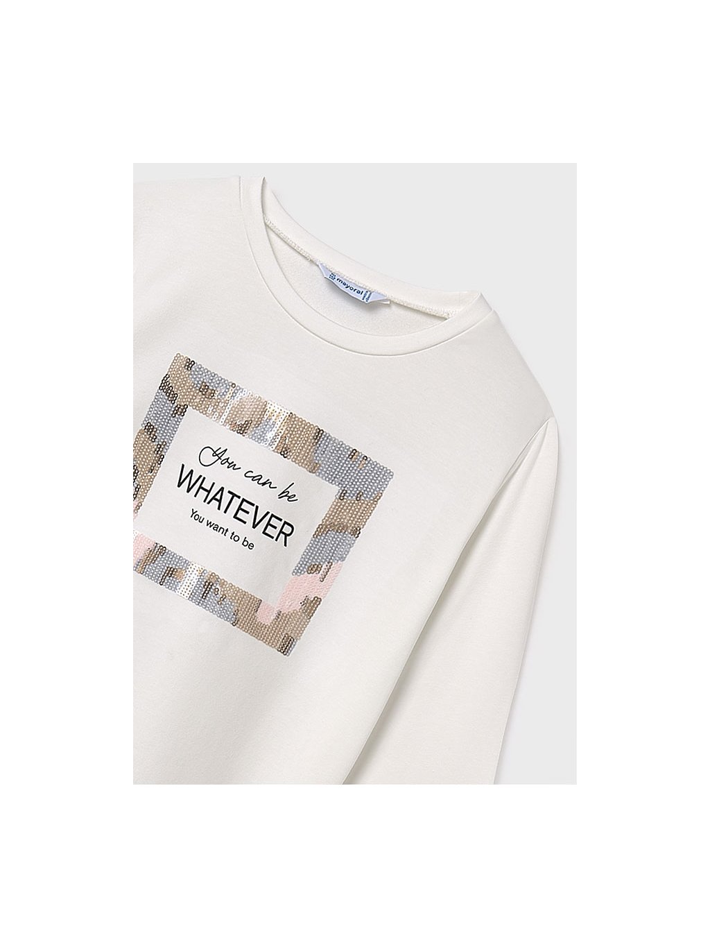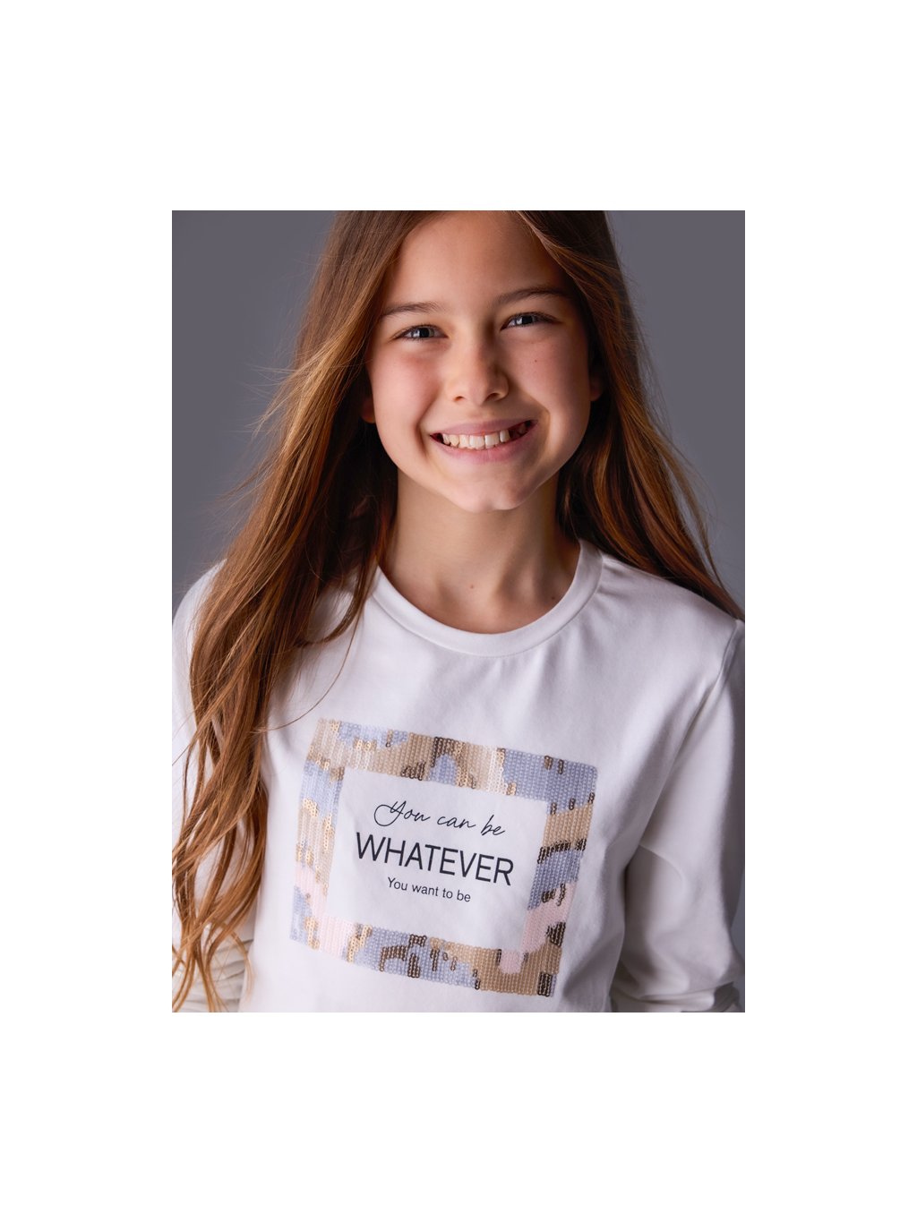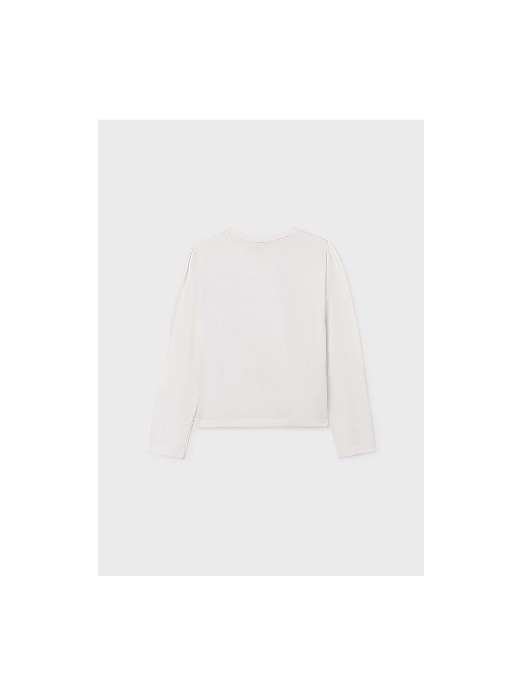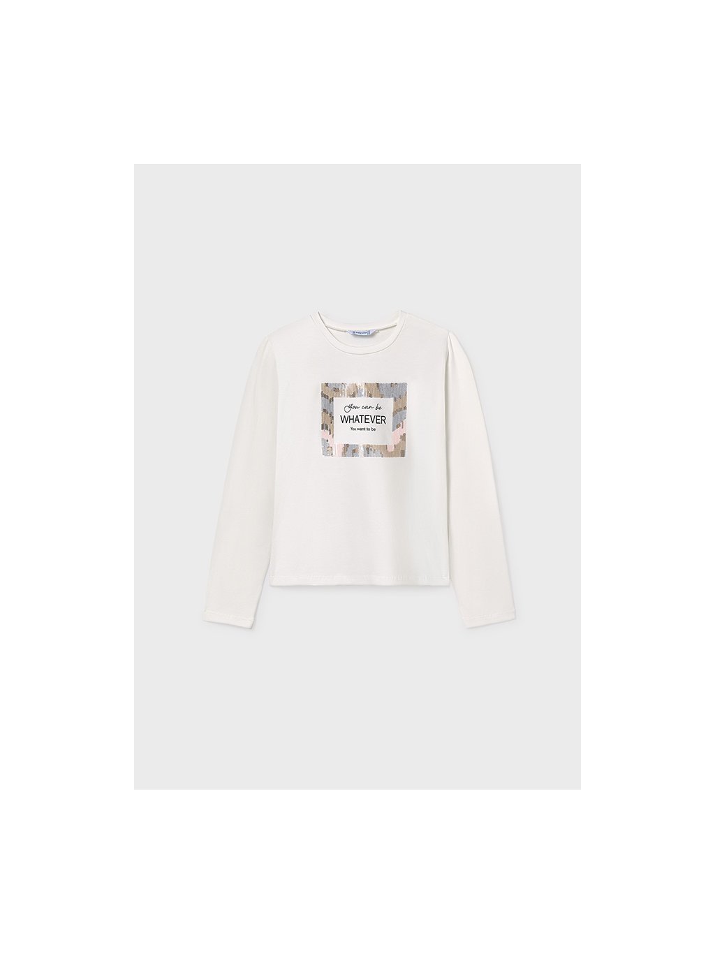 Mayoral dívčí triko s dlouhým rukávem, výšivkou a aplikací na přední straně. Triko je z velmi příjemného, pružného materiálu, na přední straně je výšivka a aplikace flitrů. U krku je kulatý výstřih.