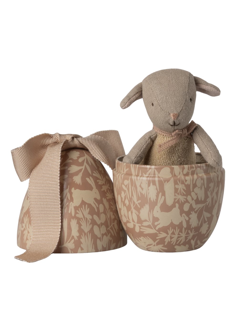 Uvnitř tohoto kovového vajíčka s krásným potiskem a velkou rypsovou mašlí nahoře najdete malého plyšového beránka. Perfektní dárek pro nejmenší. Beránek má v ručičkách magnety, takže se může vajíčko držet.