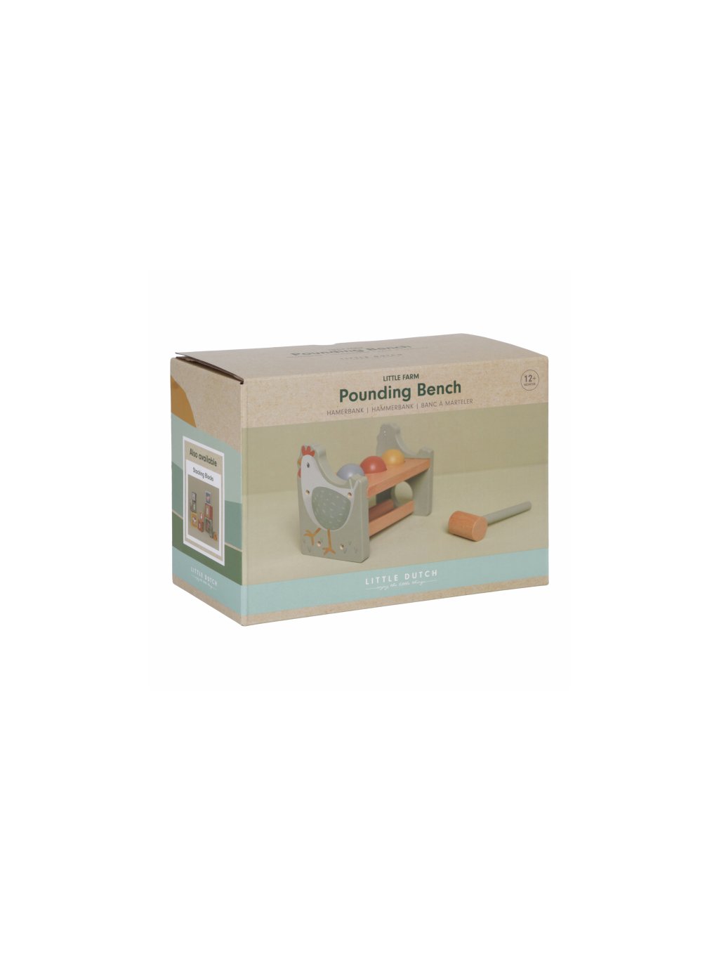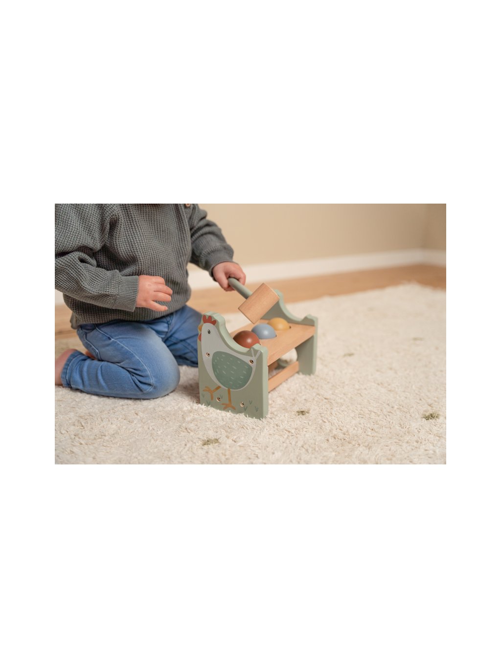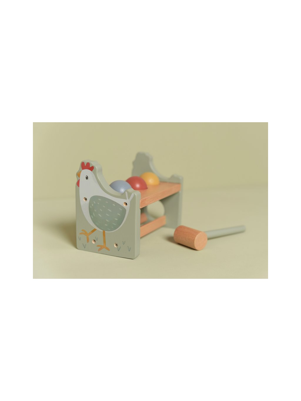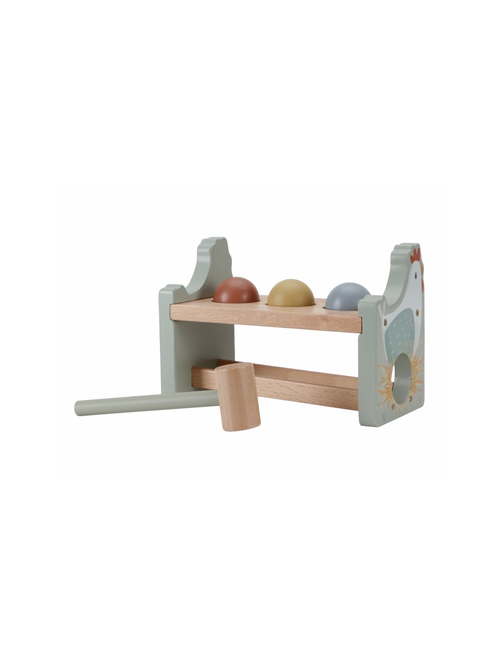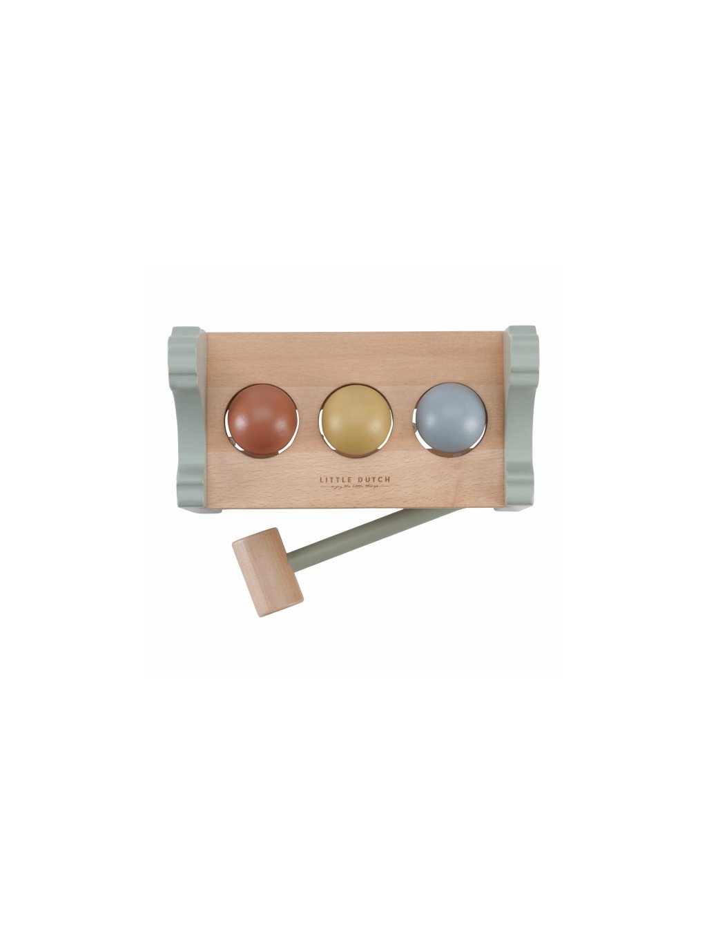 Klep sem, klep tam! Trefí vaše dítě všechny míčky? Pomocí kladiva je potřeba zatlouct 3 barevné míčky do dřevěného stojanu. Až se to podaří, stačí míčky vykutálet a začít znovu! Můžete zatloukat pořád dokola! Hračka pomáhá rozvíjet jemnou motoriku vašeho dítěte. Hračka je součástí designové kolekce hraček a doplňků Little Dutch Farma.