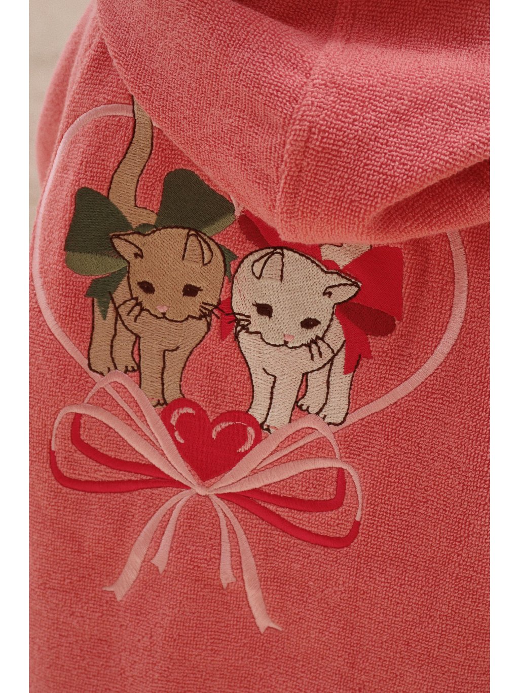 Nádherný dívčí froté župan s výšivkou kočiček. Župan je z organické bavlny. Měkký froté župánek je skvělý pomocník na zahřátí pro všechny vodní nadšence ve chvílích, kdy drkotají zuby a rty se zbarvují do modra. Po každé bublinkové koupeli, rychlé sprše nebo k bazénu, stačí jen přehodit přes sebe, zavázat a pořádně se zachumlat. Na zádech je velká výšivka růžové mašle, přední část zdobí mašlička malá.